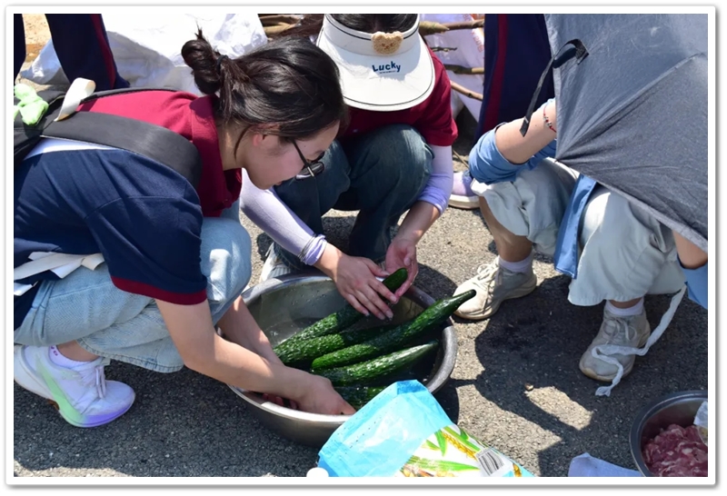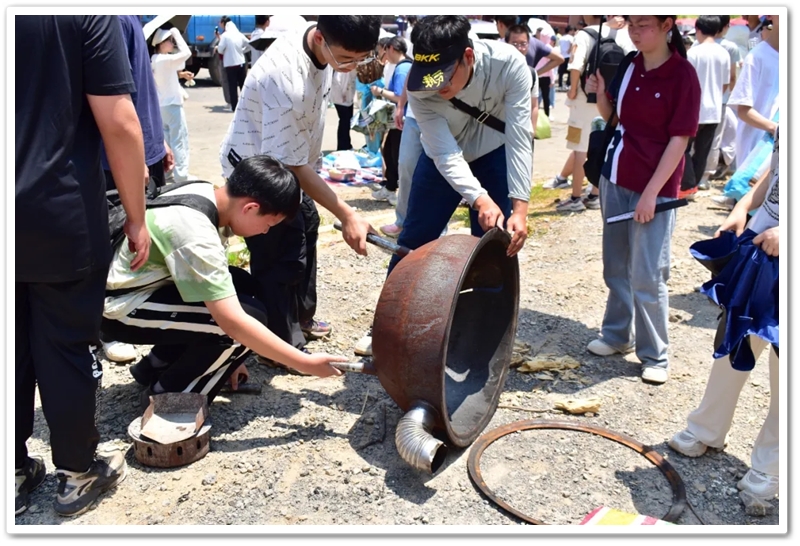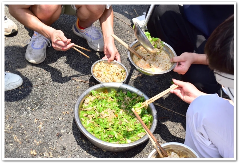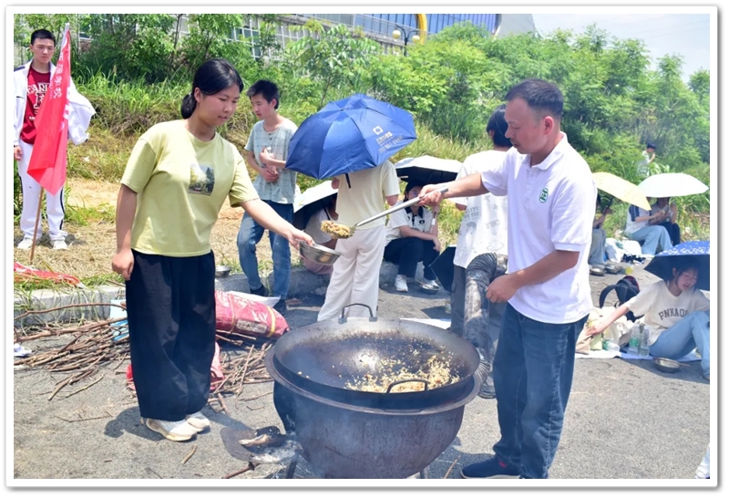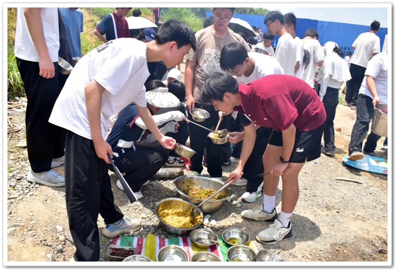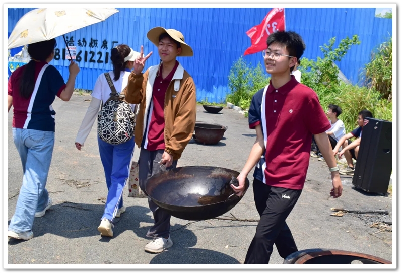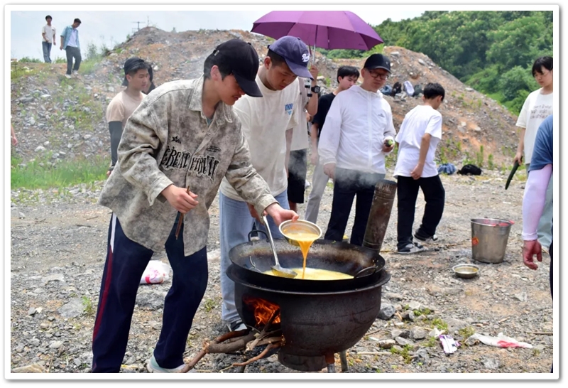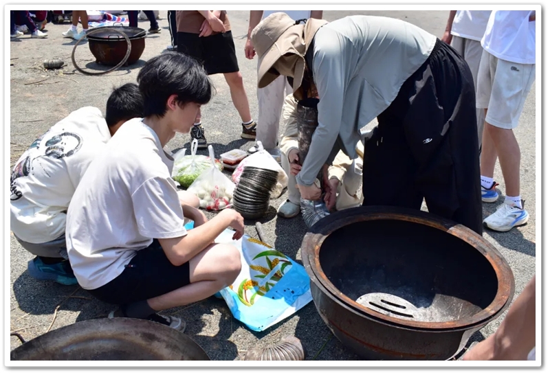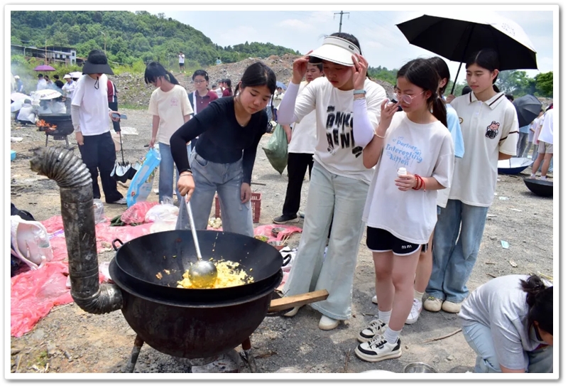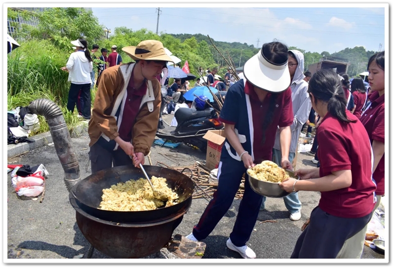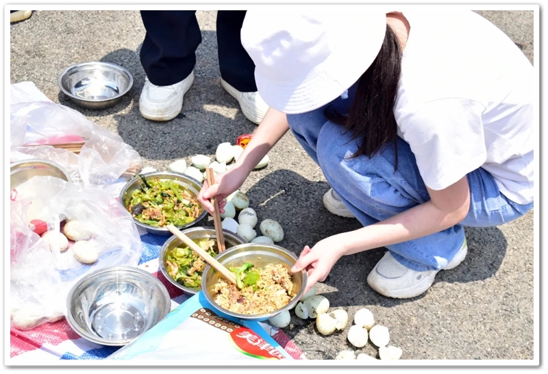 全民健身中心旁的空地上,二十二缕炊烟次第升起。各班划分的“厨房战区”里,班级内部的小组各司其职,为了那口热乎的午饭争分夺秒。“先放纸,再放柴”,烧火组的同学拿着火柴目光坚定。“先蛋炒饭,再辣椒炒肉,最后下面”放下写字的笔,掌勺的同学拿起做饭的铲,思路清晰,指挥有度。临时灶台里的火越烧越旺,炽热的红染在了同学们的脸上。当金黄的炒饭和热气蒸腾的面条终于端上野餐垫,少年们在这一堂实践课上应体悟了“粒粒皆辛苦”的真意。