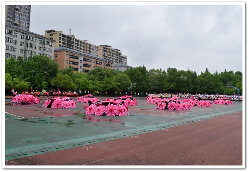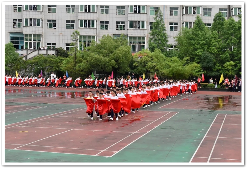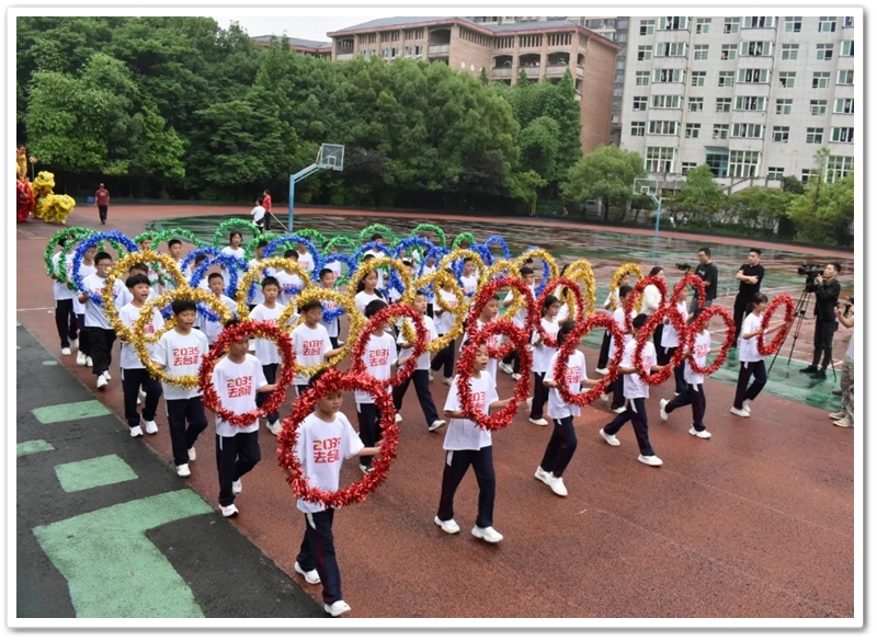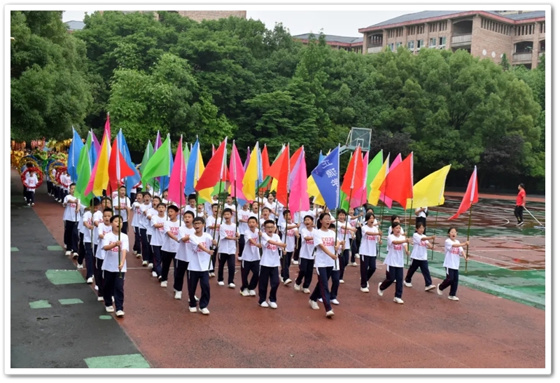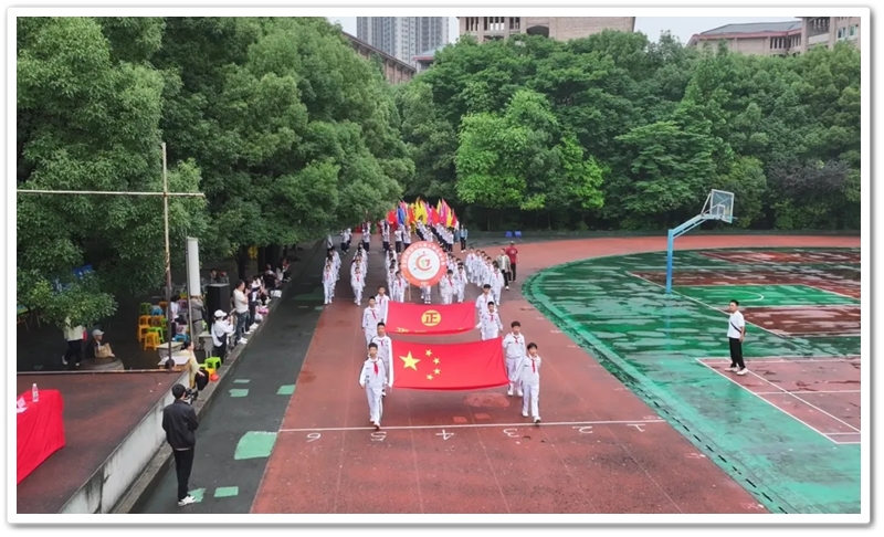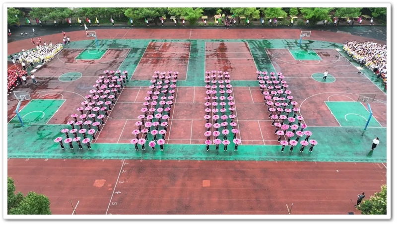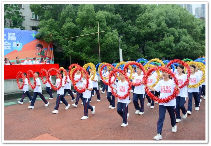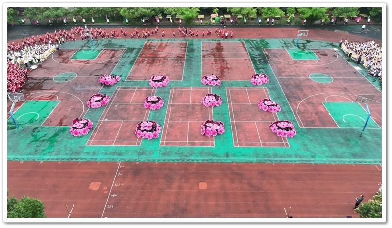 旗浪逐风去,花环映翠来。云影徘徊处,花环队翩然而至。几十名少年手持绚丽花环,宛如穿梭于“城市绿肺”间的灵动精灵。粉白花朵与校园葱郁草木相映成趣,仿若将正源学校天然氧吧的清新与生机凝于花环之上。微风拂过,花香与草木芬芳交织,花环轻旋,脚步流转,少年们眉眼含笑,似将满园绿意与烂漫时光,一同带进这活力四溢的赛场。