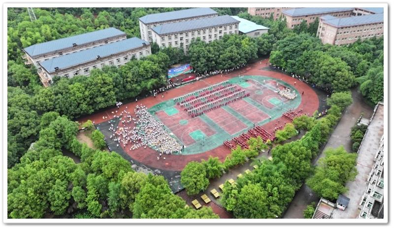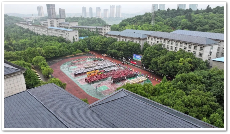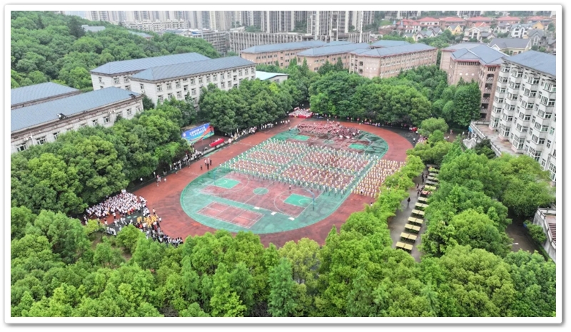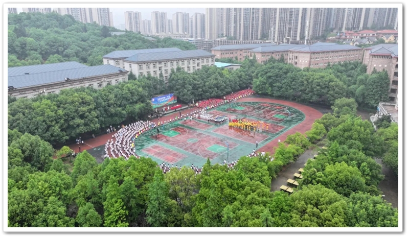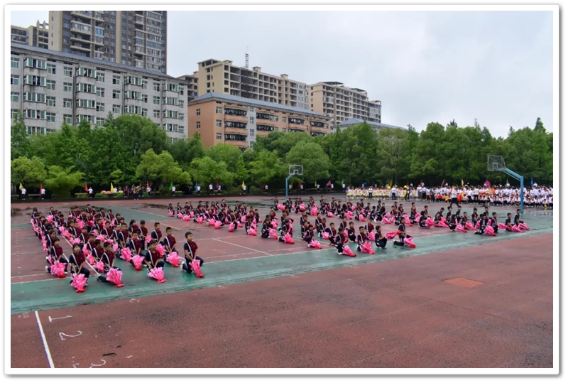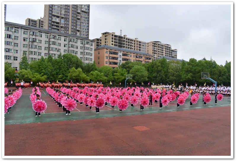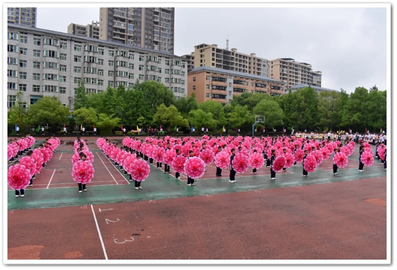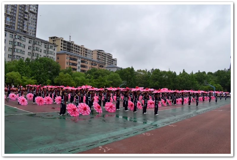 旗浪逐风去,花环映翠来。云影徘徊处,花环队翩然而至。几十名少年手持绚丽花环,宛如穿梭于“城市绿肺”间的灵动精灵。粉白花朵与校园葱郁草木相映成趣,仿若将正源学校天然氧吧的清新与生机凝于花环之上。微风拂过,花香与草木芬芳交织,花环轻旋,脚步流转,少年们眉眼含笑,似将满园绿意与烂漫时光,一同带进这活力四溢的赛场。