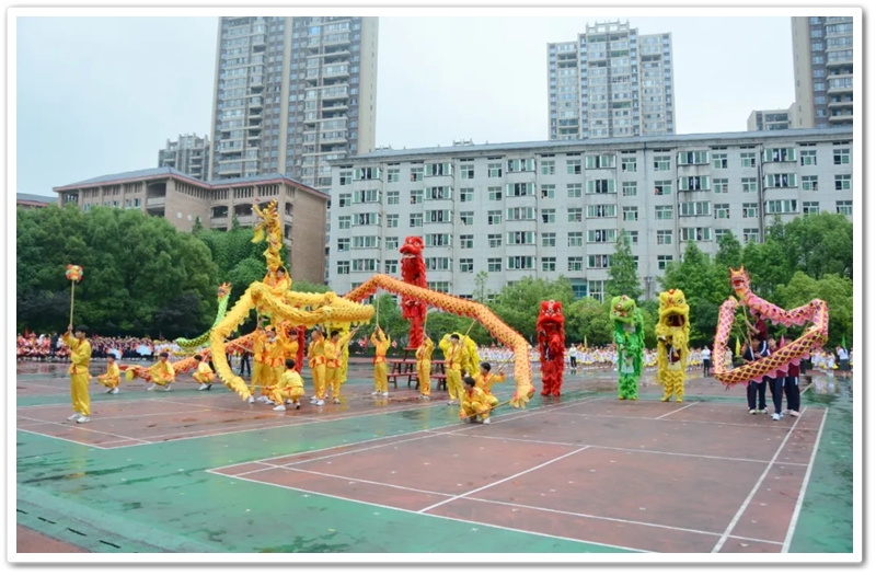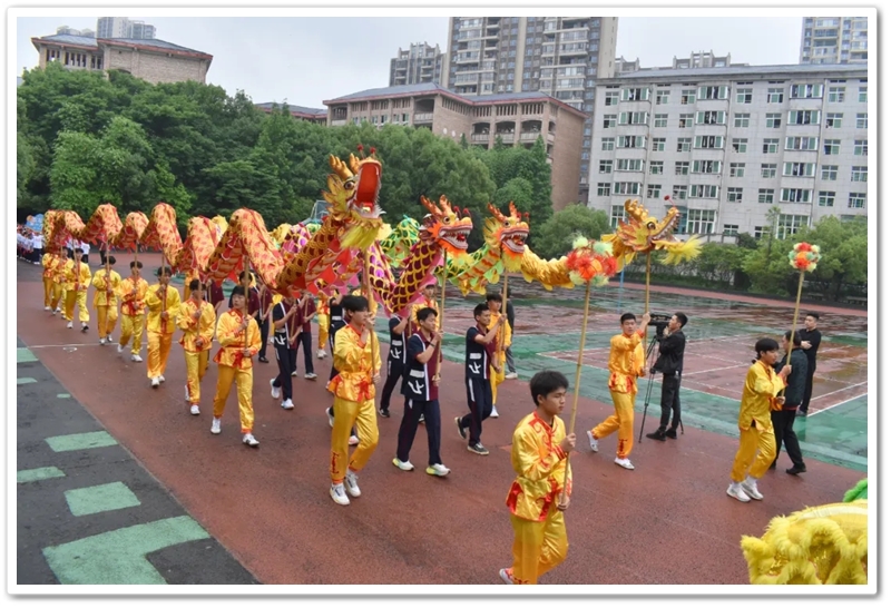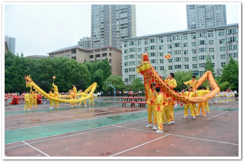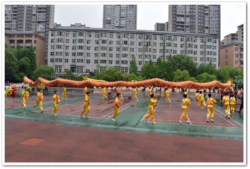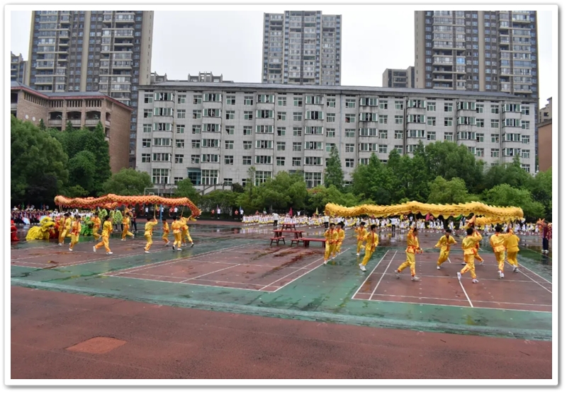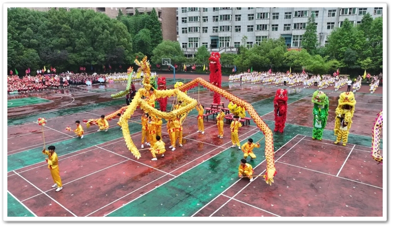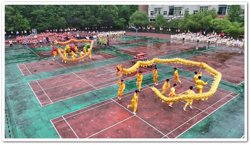 只见两条金黄色的巨龙率先破浪而出,鳞片在阳光下熠熠生辉。赤金龙与绿金龙在场上如疾风般翻腾。赤金鳞甲映着日光闪耀,绿龙身姿矫健灵动,时而腾空跃起,时而蜿蜒穿梭。它们的形态瞬息万变,时而如灵蛇蜿蜒游走,时而蜷作盘卧山岳的雄浑姿态,忽而化身为蓄势待发的龙舟——栩栩如生的龙头化作龙船之首,舞龙者默契配合,有人如摇桨般推动“船身”破浪前行,有人立于“船中”奋力击鼓。随着鼓点节奏,双龙缓缓盘起,龙头高高昂起,龙须飞扬,龙目炯炯,尽显威武霸气,金色的“龙舟”似要冲破风浪,在激昂的鼓点与翻涌的“水波”中奋勇向前,寓意着正源这艘教育航母在未来的征程中定能乘风破浪,行稳致远;而当巨龙昂首腾飞时,更是气势雄浑,昭示着正源学校在耒阳教育界独占鳌头的王者风范。