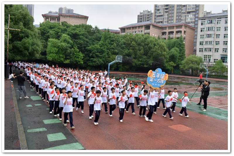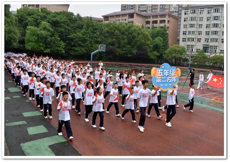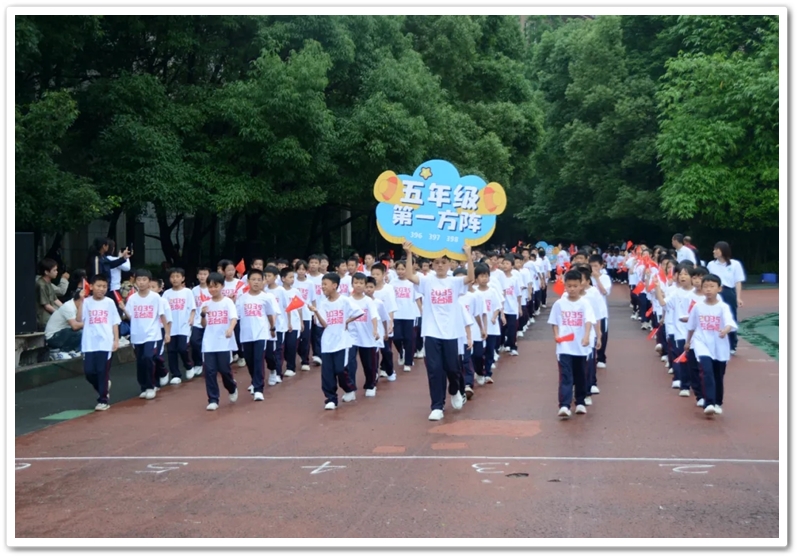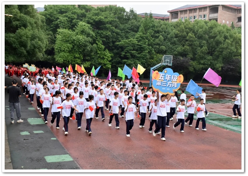 五年级第二方阵由399、400、401班集结而来。这群活泼少年,以拼搏汗水浸润赛场,用晶莹泪水拥抱胜利。他们坚信,有梦之处,必能翱翔,将以激情演绎最美运动,用青春书写亮丽人生。第三方阵的404、405班,如金阳跃动少年心,似新竹拔节指苍穹,三班少年齐奋进,在赛场挥洒汗水,谱写华章。