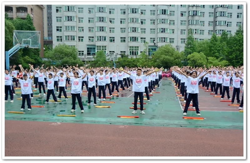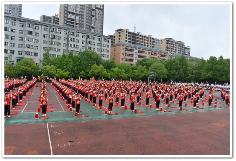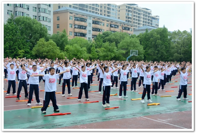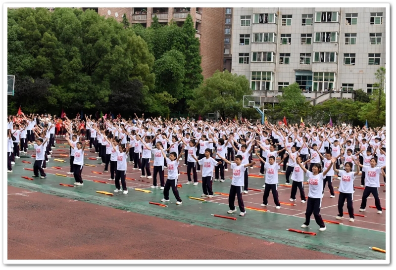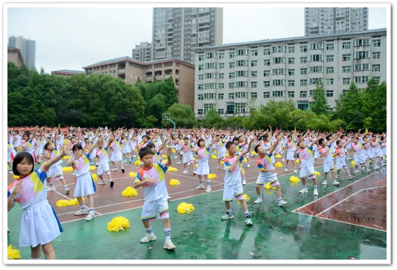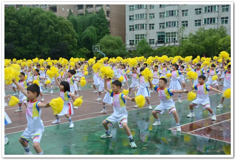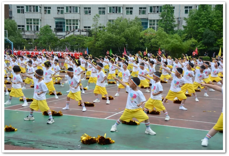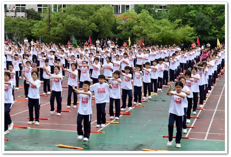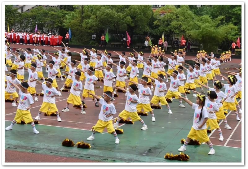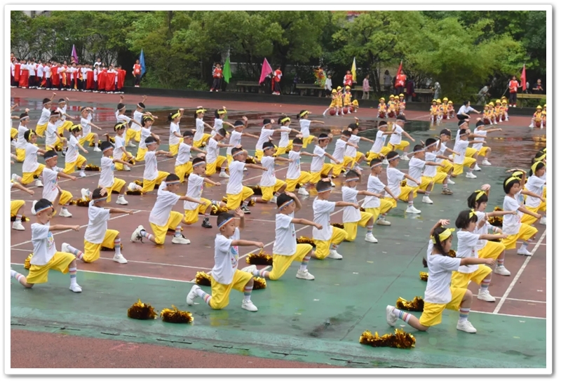 龙狮腾跃的余韵尚未散尽,青春的活力已如潮水奔涌而来。随着音乐响起,三年级300多名同学穿着色彩鲜艳的运动服,像欢快的小太阳般列队就位。随着《蹦吧蹦吧》动感的节奏响起,孩子们齐刷刷挥动手臂,脚尖轻点地面,马尾辫、棒球帽跟着上下跳动,胸前的卡通徽章在阳光下闪闪发亮。
