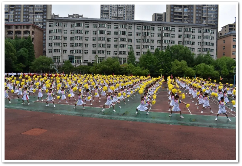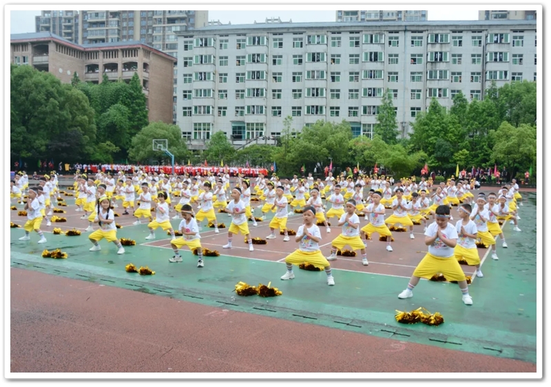 前排的小女孩跳得格外起劲,圆圆的脸蛋笑成小苹果,每一个踢腿动作都带着风;后排的男生们也不甘示弱,伸展手臂时像展翅的雏鹰,跳跃落地时“咚咚”声响成一片。队伍中不时飘出清脆的笑声,有几个调皮鬼还偷偷对着观众席做鬼脸。当音乐唱到高潮部分,大家手拉手组成彩色波浪,整齐地左右摇摆,动作轻盈又充满力量,连空中的小鸟都仿佛被吸引,围着操场盘旋欢叫。这场元气满满的表演,让整个校园都跟着蹦跶起来!