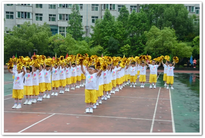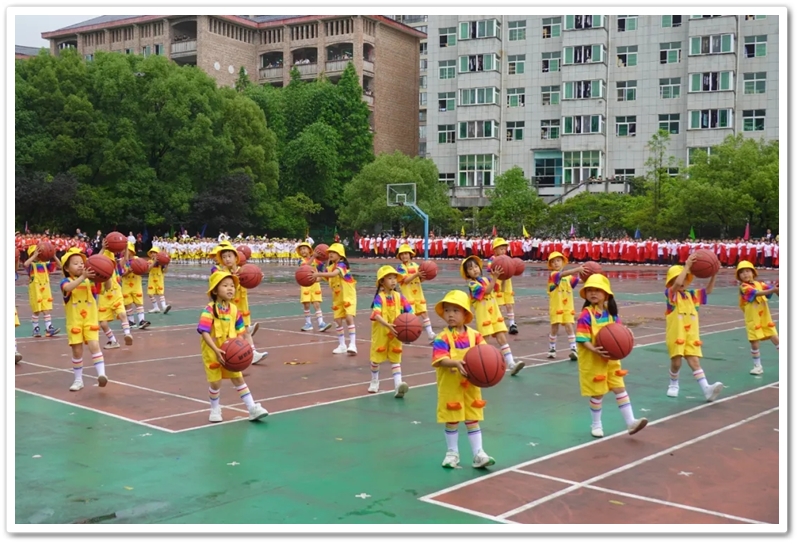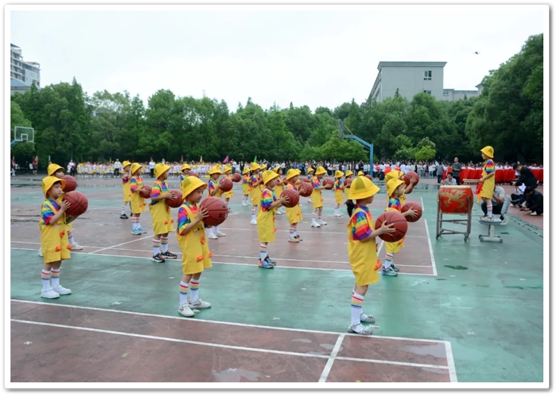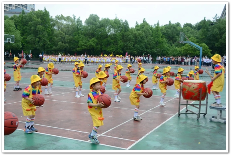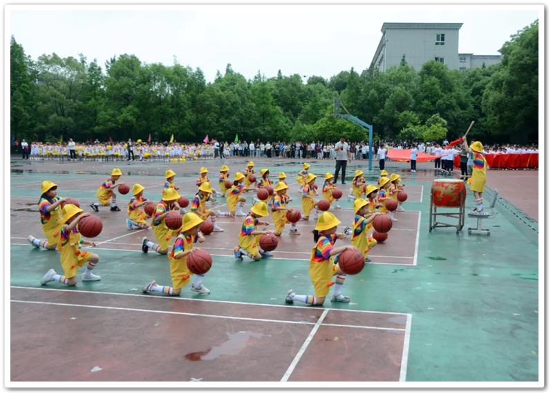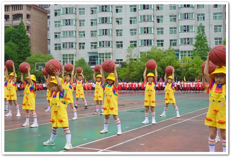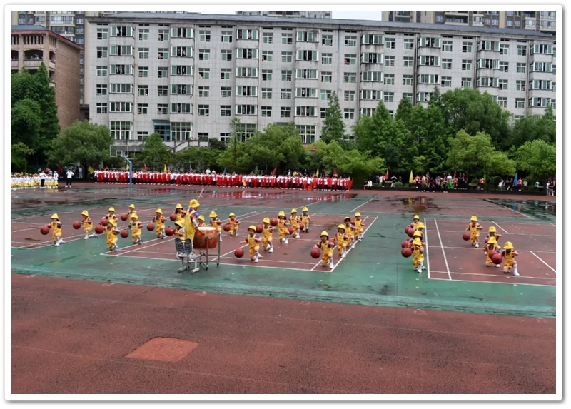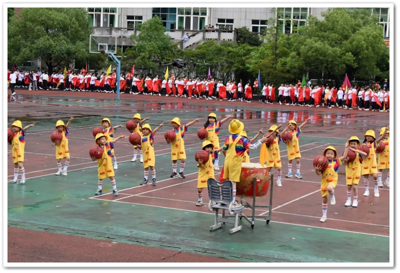 当祝福的旋律还在操场上空回荡,一群“萌趣小旋风”已踏着音符闪亮登场!随着《中国冲冲冲》的旋律响起,萌态大军“突袭”舞台!30来个戴着黄色小圆帽、穿着黄色背带裤的的小朋友,抱着比脸还大的篮球,摇摇晃晃地跟着刘欢老师站定,队伍的最前方摆放一面大鼓,一位小帅哥站在涂满彩绘的椅子上,双手紧握鼓槌,随着音乐节拍用力击鼓,其余小朋友和着鼓点拍球。刘老师示范运球,时而弯着腰脸朝右边,时而弯着腰面朝左边,时而朝前时而朝后,孩子们立刻有样学样,圆鼓鼓的脸蛋憋得通红,肉乎乎的小手用力拍打着篮球,“砰砰”声和奶声奶气的数数声混在一起:“1、2、3……哎呀球跑啦!”