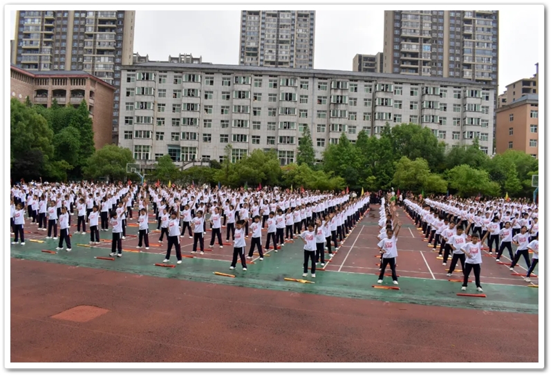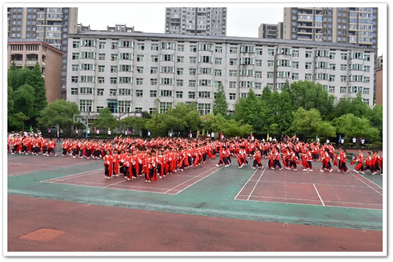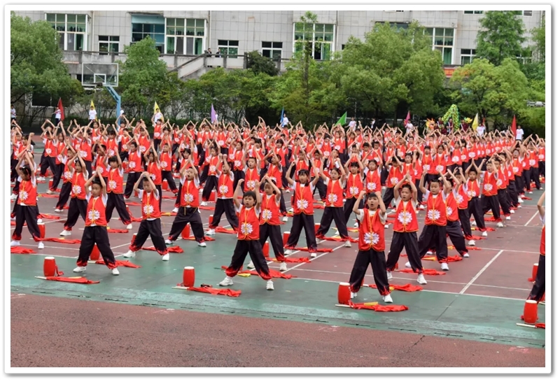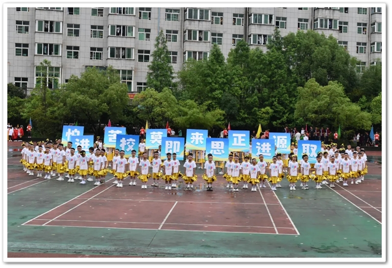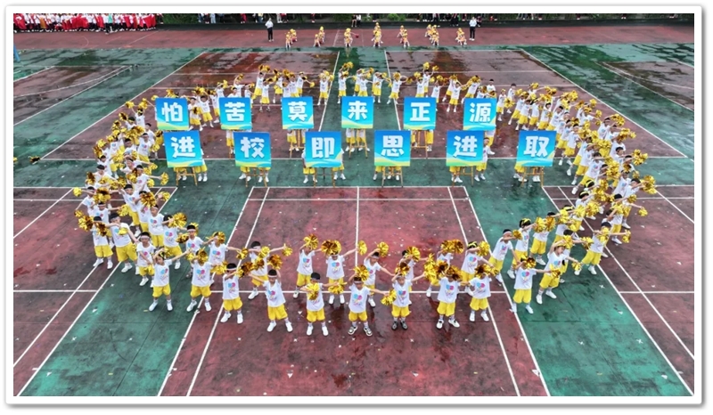 而后,孩子们重新归位,身姿挺拔如小树苗。随着整齐划一的“童子拜佛、罗汉撞钟、仙人指路”口诀响起,他们动作刚劲有力,一招一式尽显武术操的精气神,蓬勃朝气在阳光下肆意舒展。稍作停顿,队形再次变换,巧妙地勾勒出正方形与圆形,象征“正源”之名。24名学生分立两行,高举汉字牌,“进校即思进取,怕苦莫来正源”的校训在微风中熠熠生辉,孩子们齐声高呼,声音清脆而激昂,将正源精神铭刻心间。