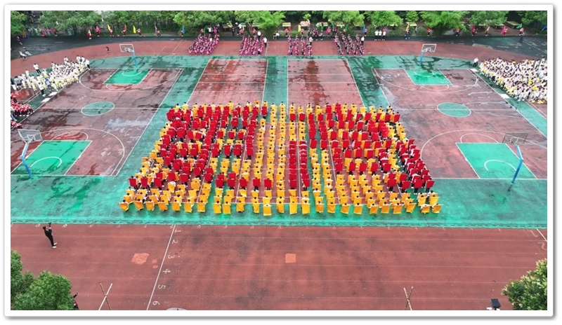 篮球操的萌趣余温未散,一场气势恢宏的视觉盛宴已震撼开场!五年级同学们迅速集结,在操场上化作灵动的画笔,眨眼间,一根巍峨的“旗杆”拔地而起,一面巨型“五星红旗”在“旗杆”顶端舒展飘扬,鲜艳的红色与金黄的五星在阳光下闪耀,仿佛真有微风拂过,让爱国情怀在每个人心中激荡。