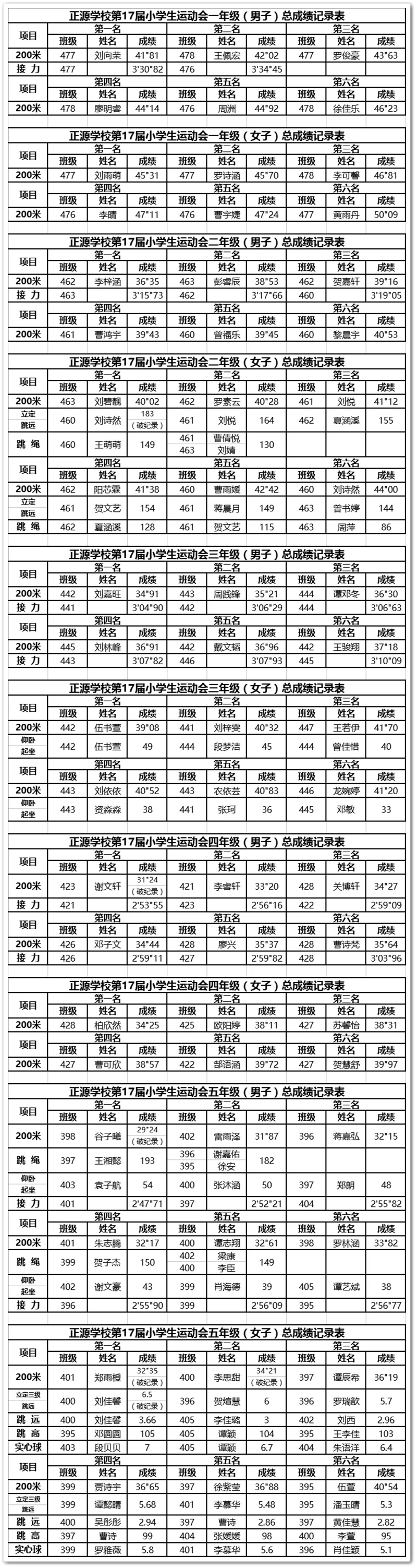 今天上午,径赛为:一到五年级男女子200米决赛;田赛为:五年级女子跳高、跳远、实心球、立定三级跳远决赛,二年级女子立定三级跳远、跳绳决赛,五年级男子跳绳、仰卧起坐决赛,三年级女子仰卧起坐决赛。