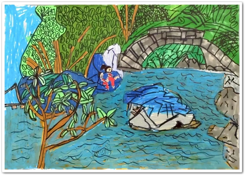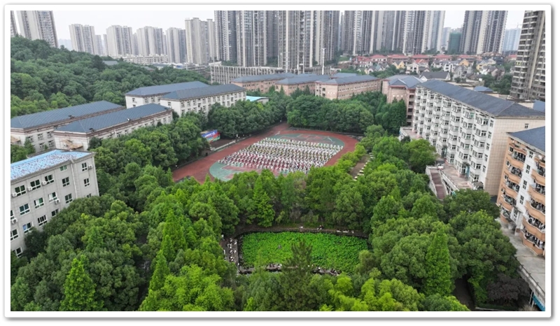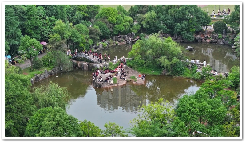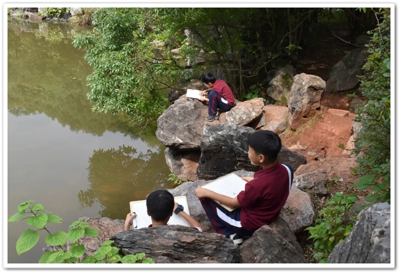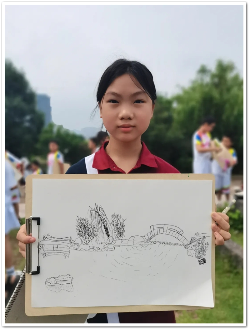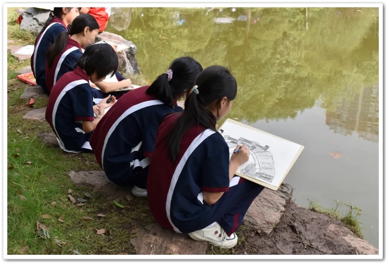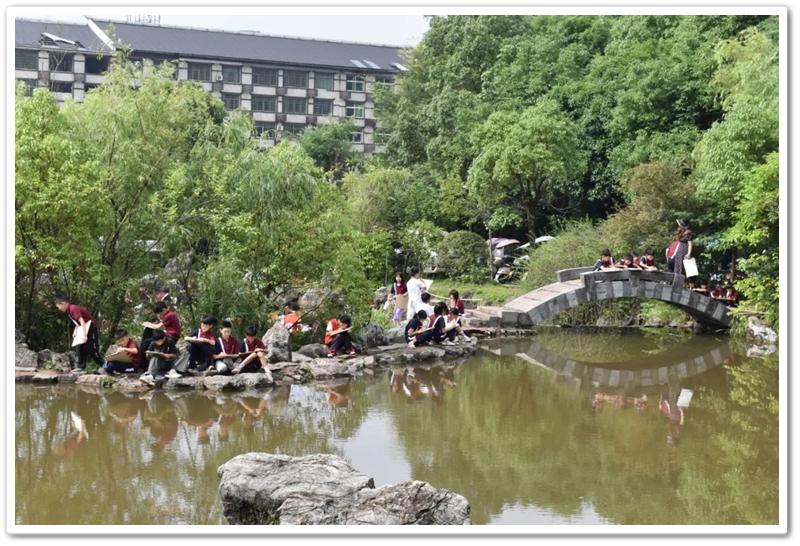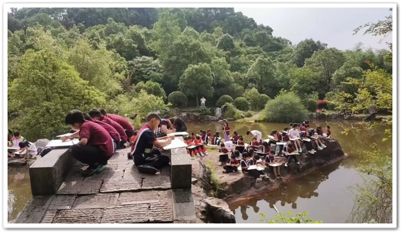 南门艺术营地:池塘碧波、国旗飘扬、东苑绿意,教学楼巍然矗立,小桥静卧曲水之上,小画家们在此捕捉校园标志景致的灵动气韵。