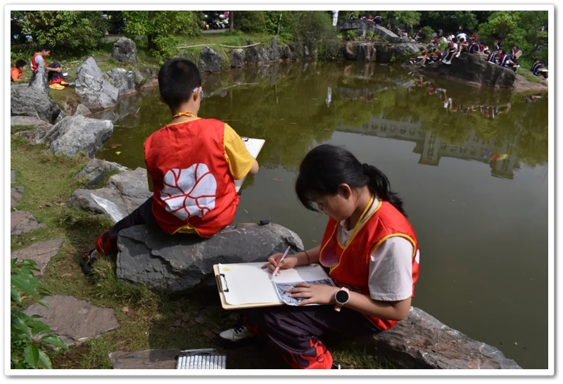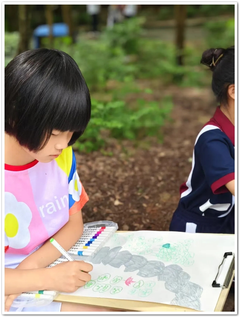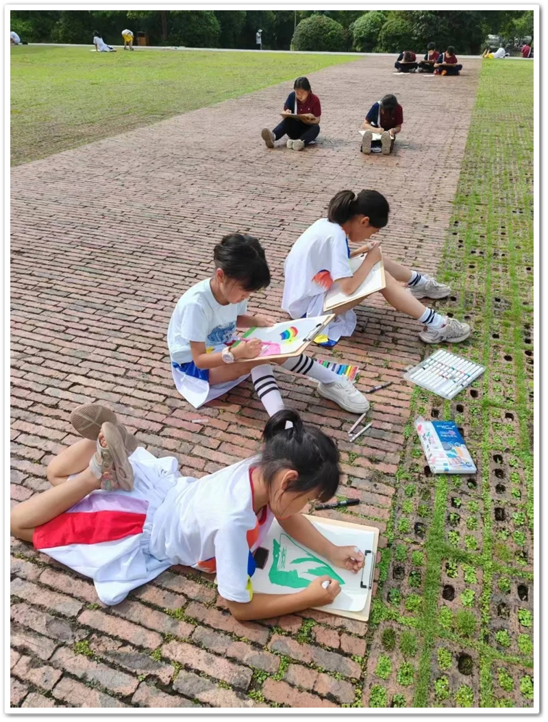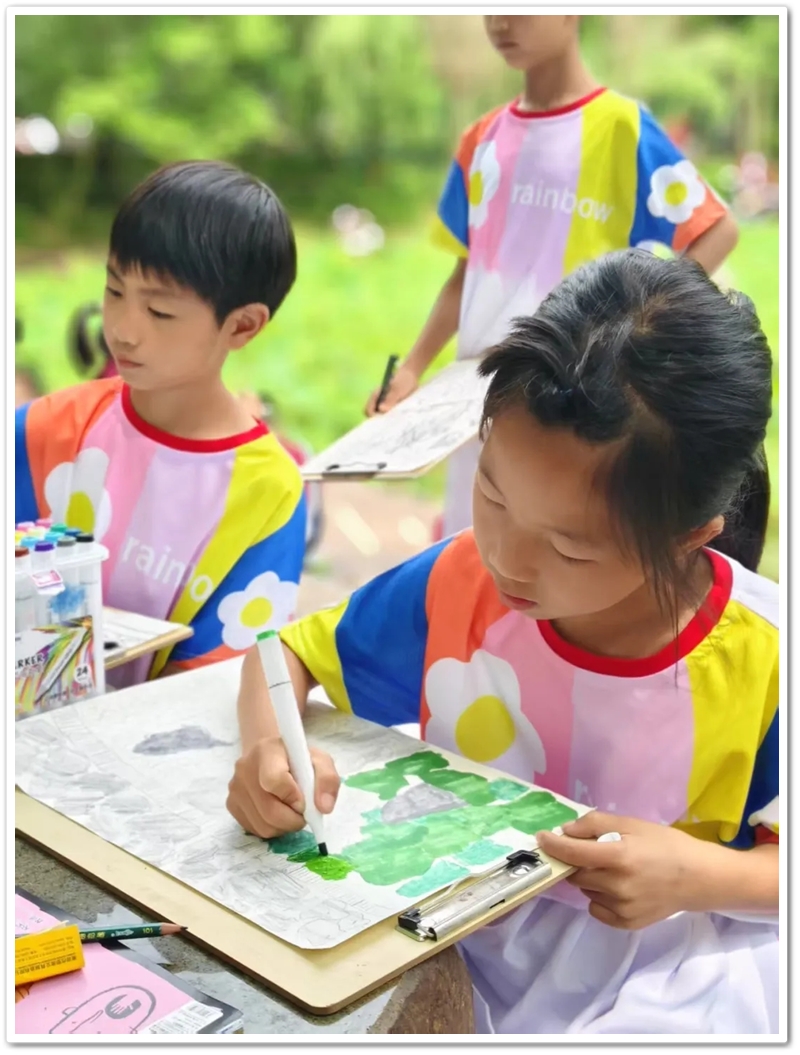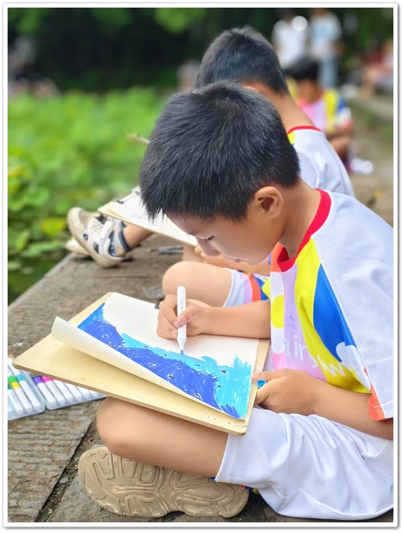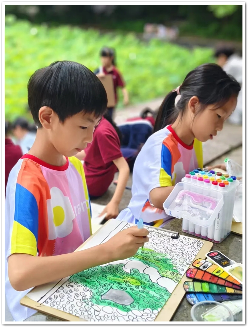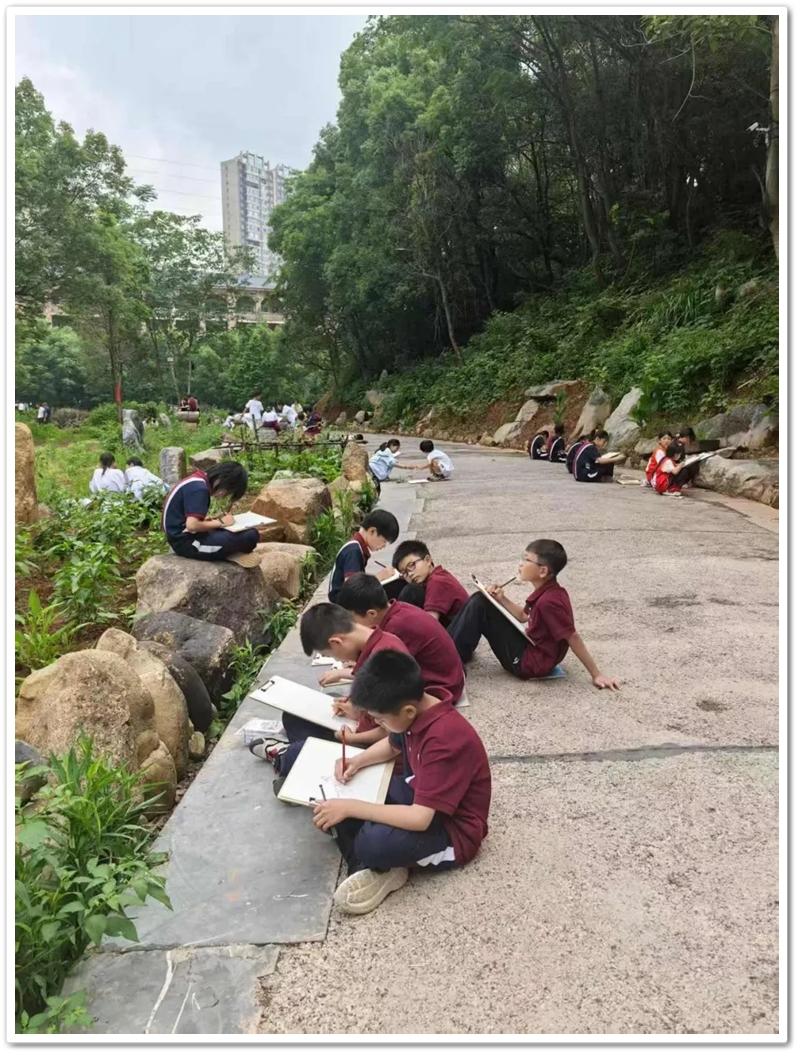 孩子们在老师的视野守护下,或凝神观察,或专注勾勒,或尽情挥洒,将眼中的校园之美倾注于笔端,运动场、池塘边、绿荫下处处跃动着创作的灵感与专注的身影。