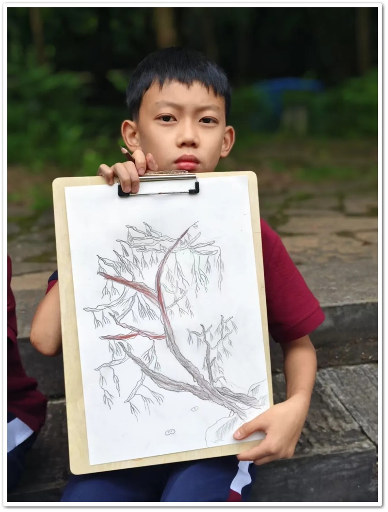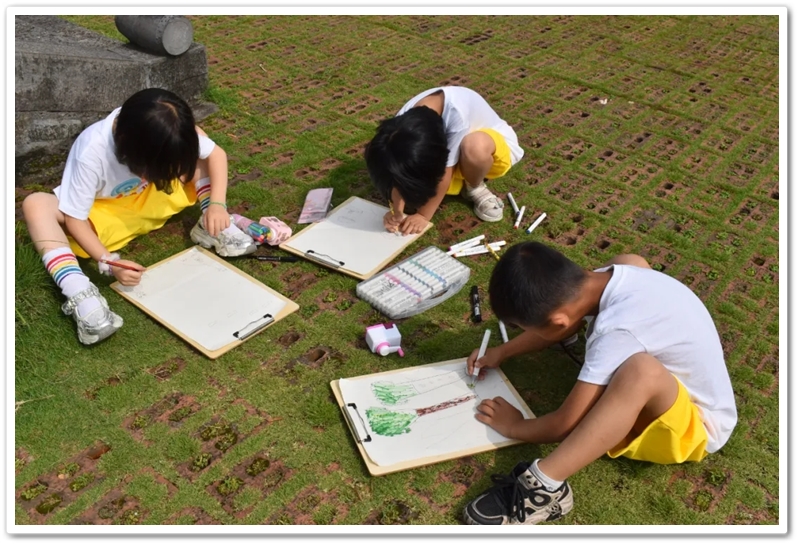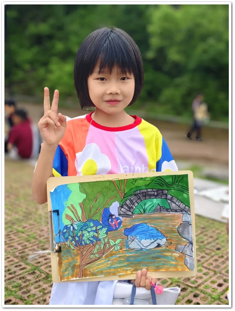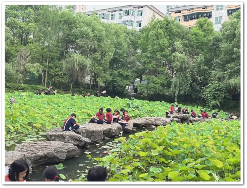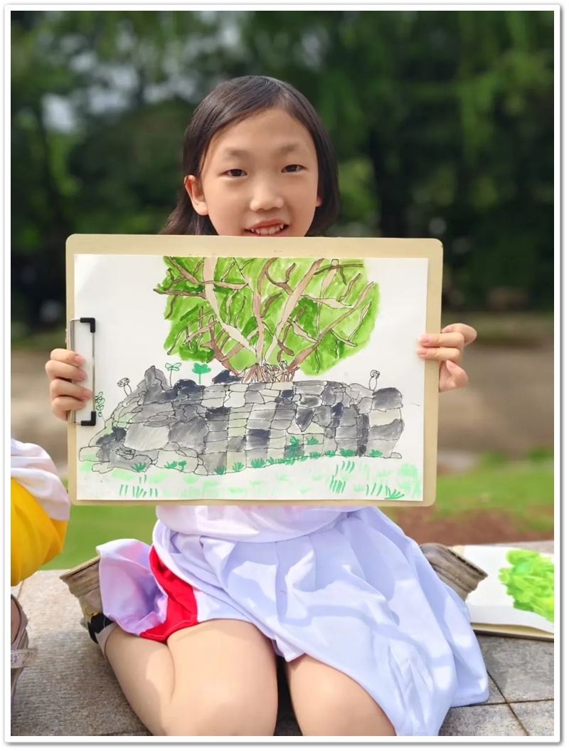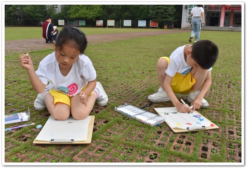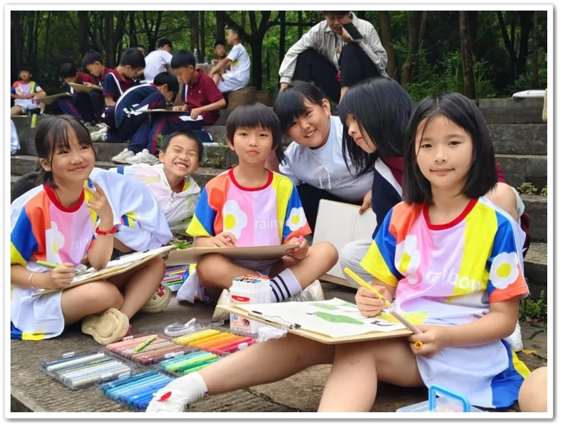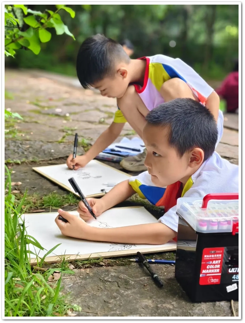 孩子们在老师的视野守护下,或凝神观察,或专注勾勒,或尽情挥洒,将眼中的校园之美倾注于笔端,运动场、池塘边、绿荫下处处跃动着创作的灵感与专注的身影。