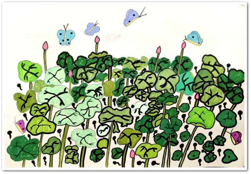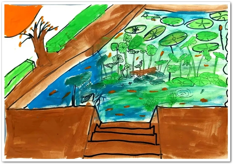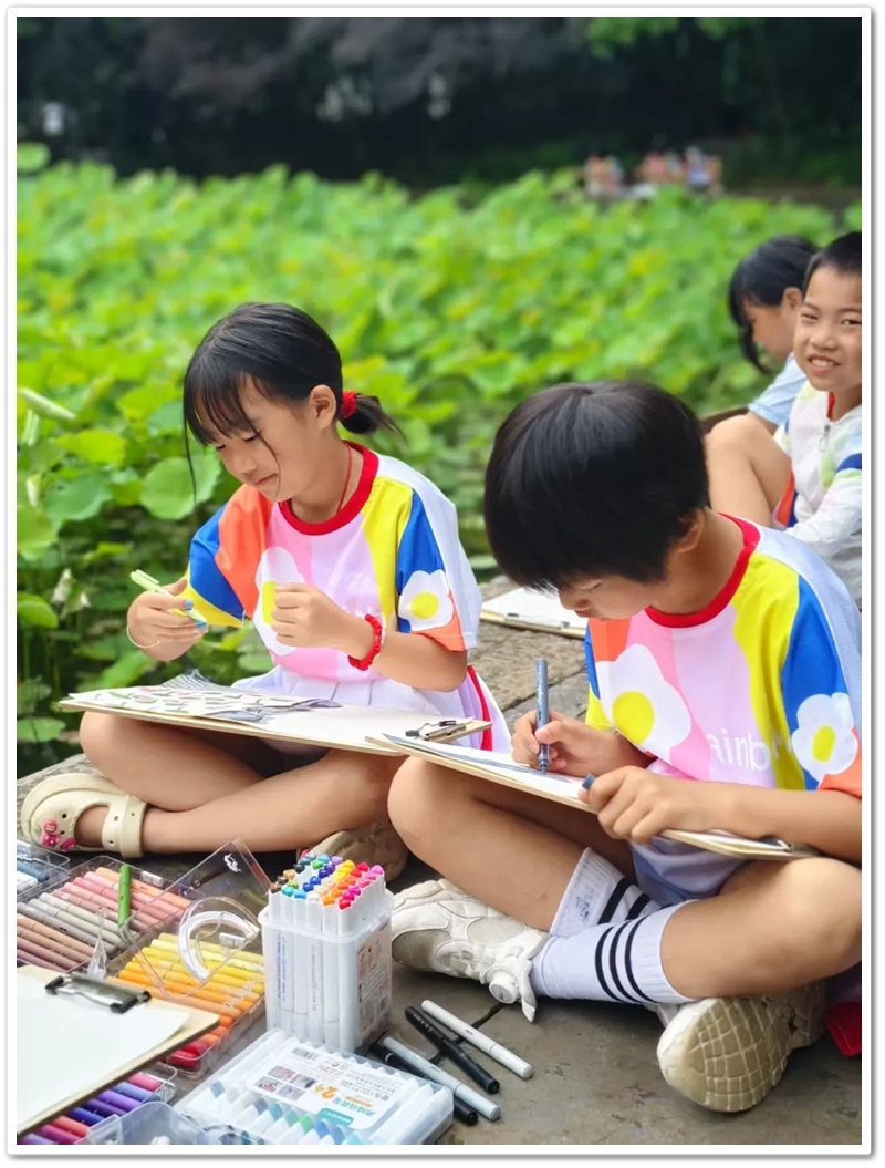 荷花池·运动场艺术营地: 荷叶田田、池水潋滟,孩子写生的身影与周边景观相映成趣,成为孩子们描绘自然之美的绝佳素材。