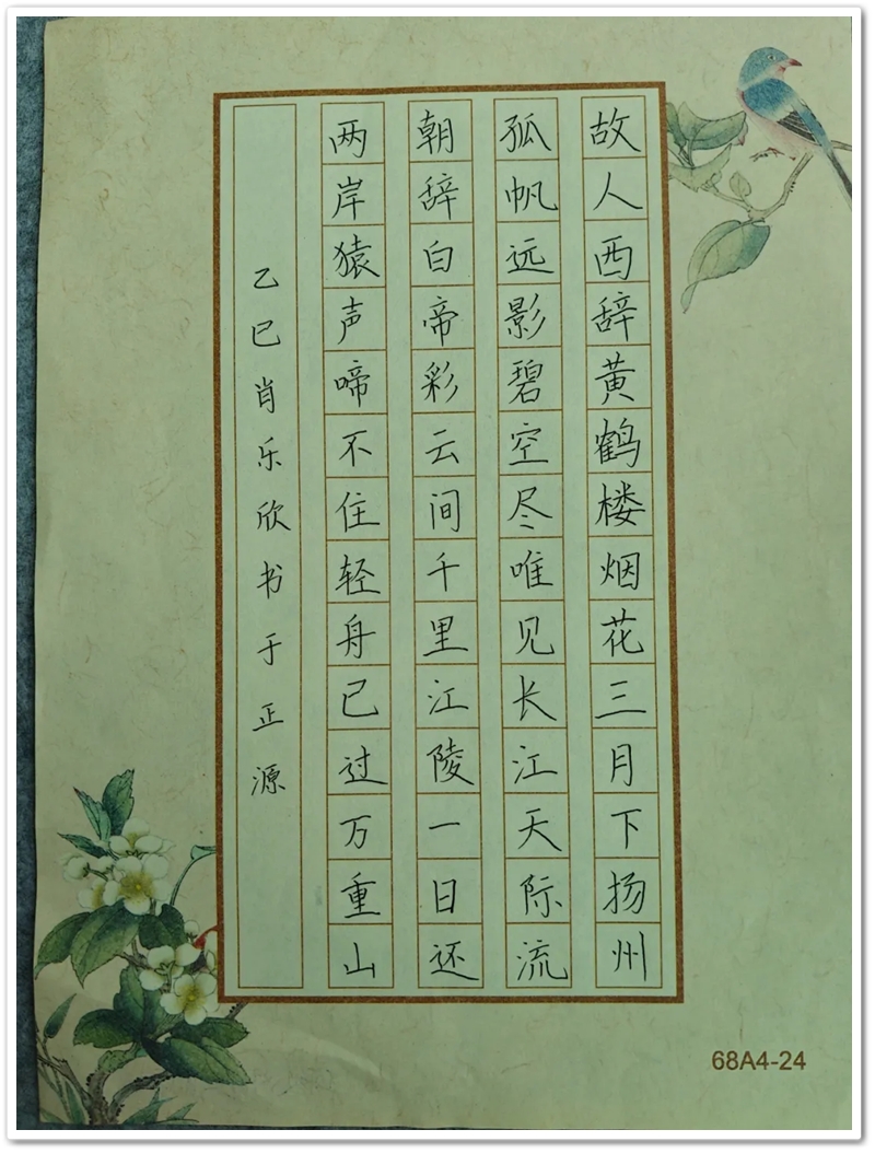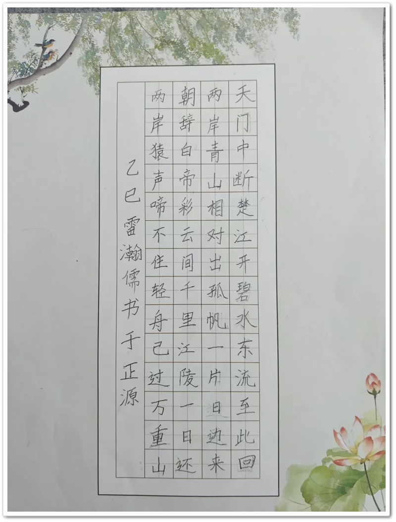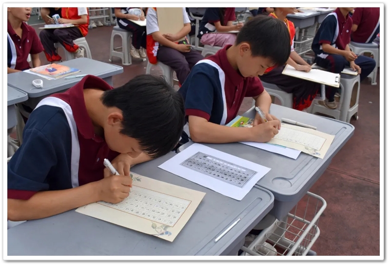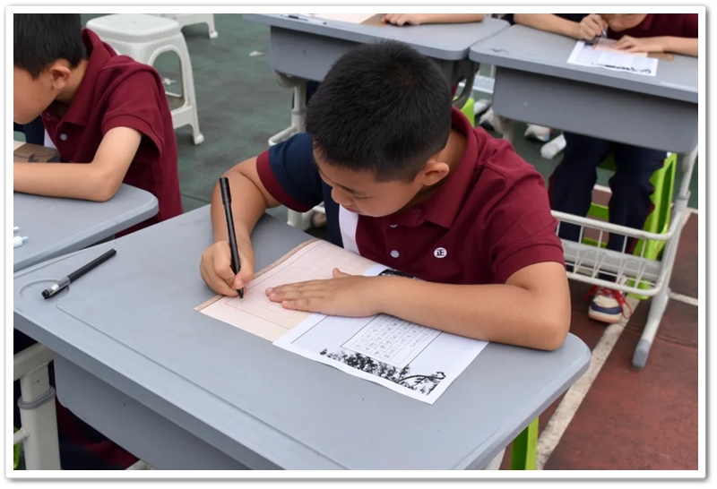 你瞧!赛场上,低年级的小朋友们坐姿端正,眼神专注,稚嫩的小手紧握铅笔,一笔一划认真书写。他们或许还不能将笔画写得十分完美,但那股认真劲儿却让人感动。一横一竖,是他们对汉字的好奇与探索;一撇一捺,是他们对书写的执着与热爱。随着年级的升高,同学们的书写愈发熟练,字体也更加规范美观:字体工整,结构匀称,笔画粗细一致,将硬笔书法的工整之美展现得淋漓尽致。有些同学更是展现出了扎实的功底,他们的作品不仅字迹清晰、美观,还融入了自己对古诗的理解与感悟,让每一个字都仿佛有了生命!