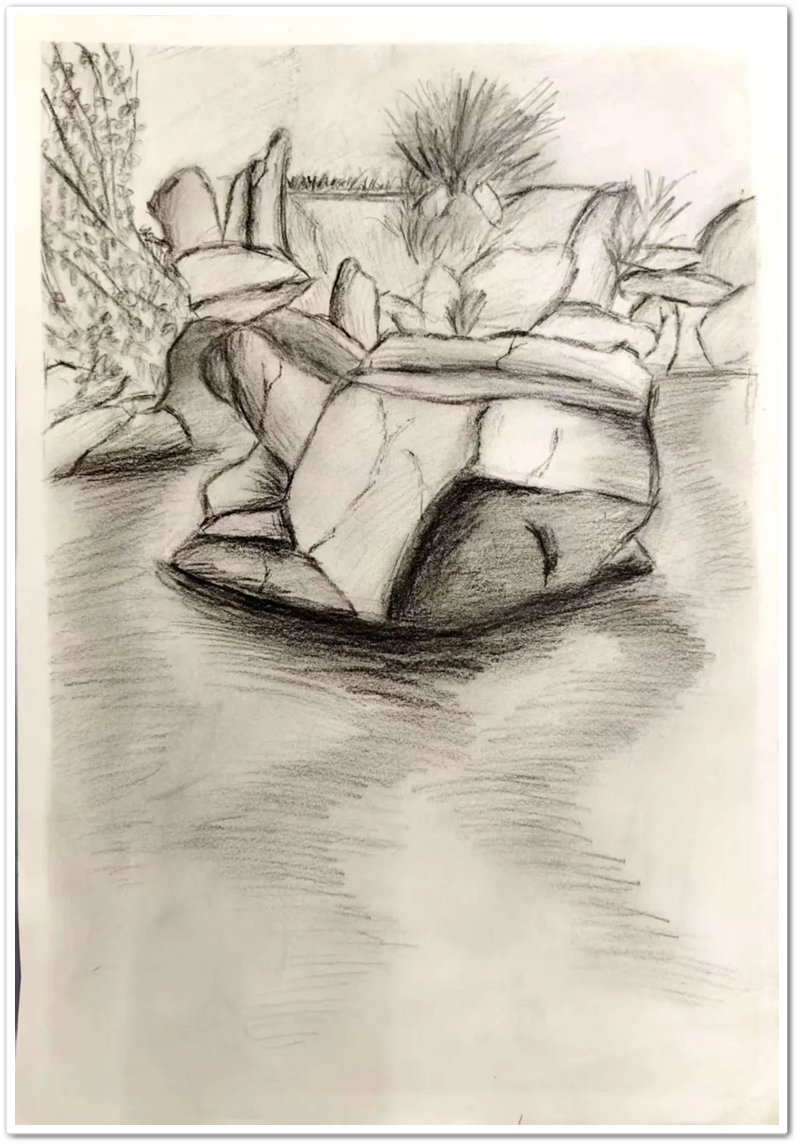 新西门马路艺术营地:崭新的道路与两旁景致,嶙峋怪石与花草树木的组合,为创作注入了现代校园的崭新视角。