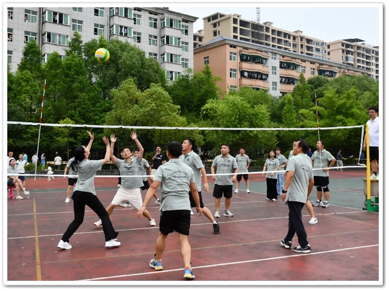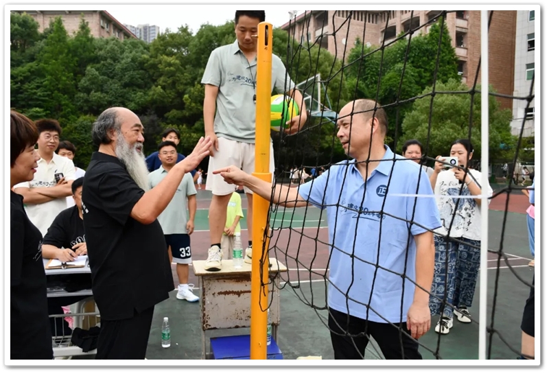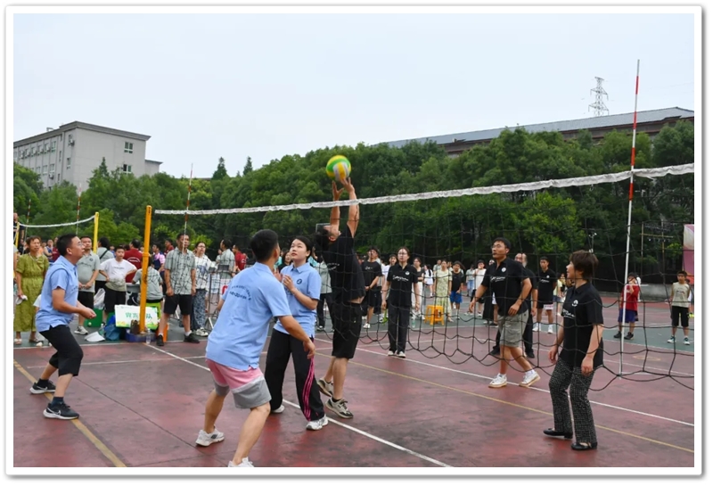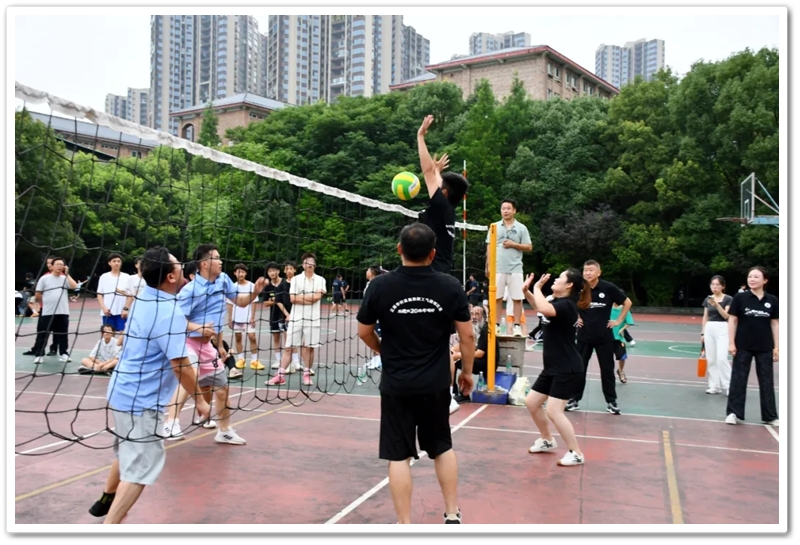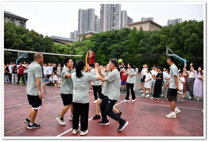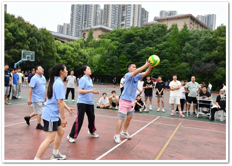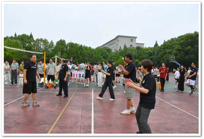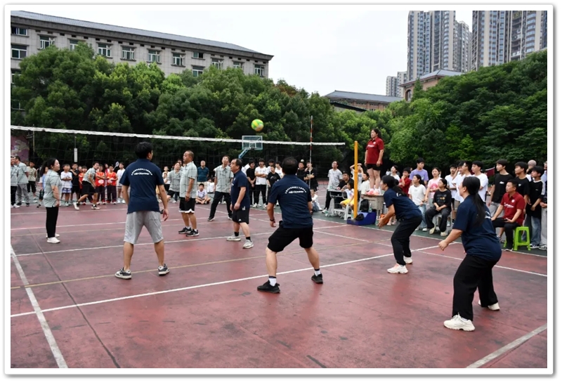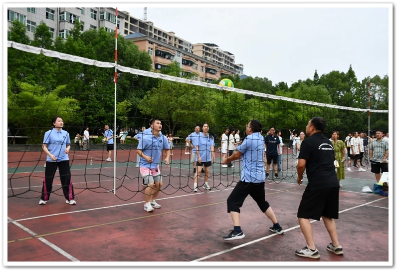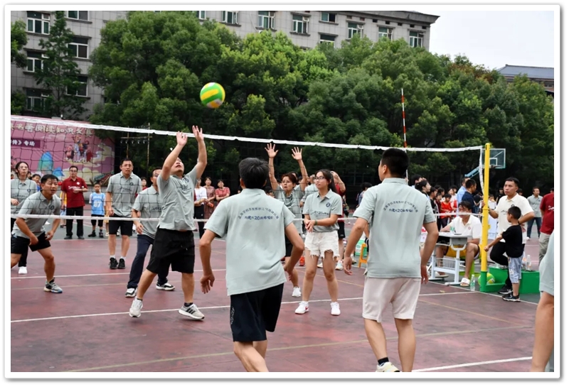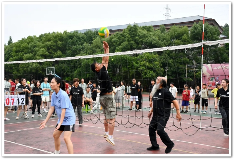 党支部书记毛小波宣布比赛开幕后,各年级处室代表队立即展开角逐。值得一提的是,年轻时曾任过排球队长的罗校长与夫人梁晓芬老师联袂出战晋级赛,将现场氛围推向高潮。