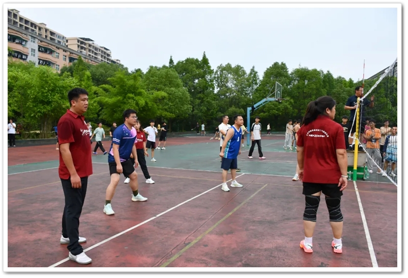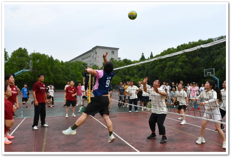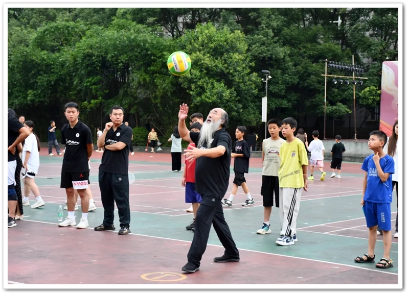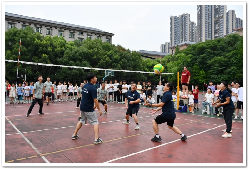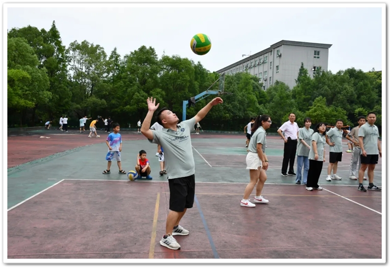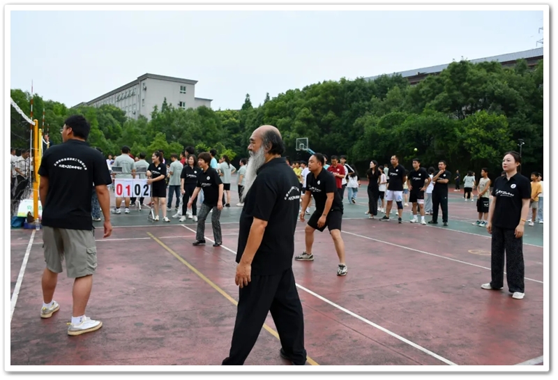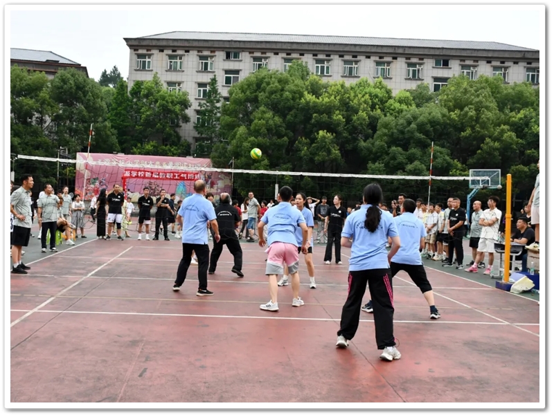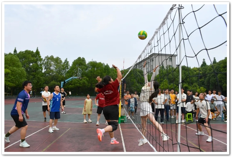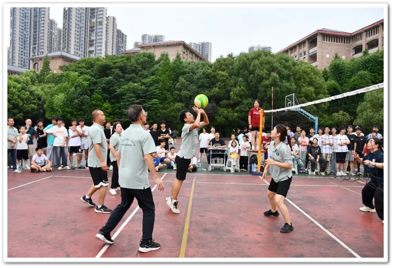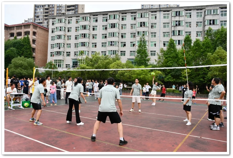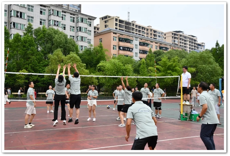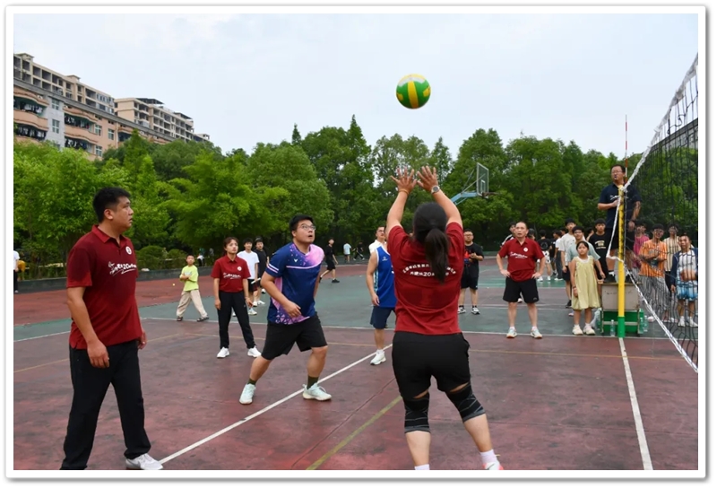 党支部书记毛小波宣布比赛开幕后,各年级处室代表队立即展开角逐。值得一提的是,年轻时曾任过排球队长的罗校长与夫人梁晓芬老师联袂出战晋级赛,将现场氛围推向高潮。