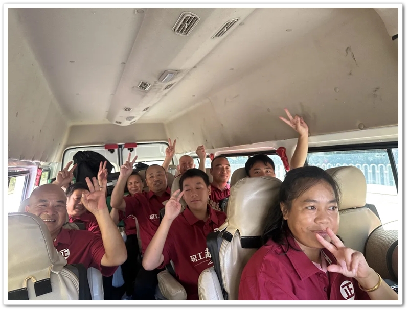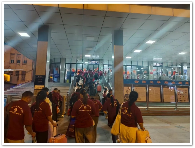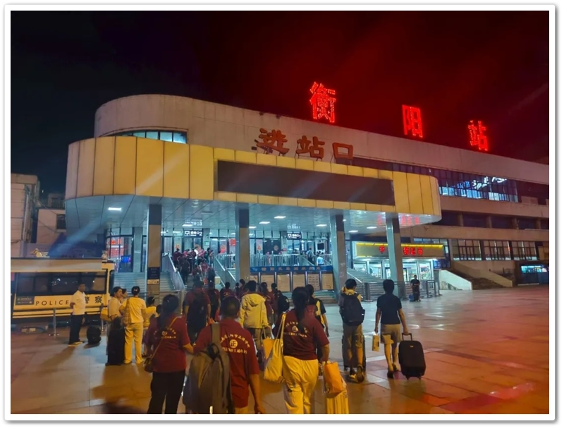 随即,第二队职工的红装汇成洪流,乘大巴转道衡阳火车站。月台上,行李箱的滚轮与铁轨的轰鸣共奏进行曲。