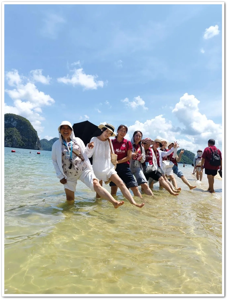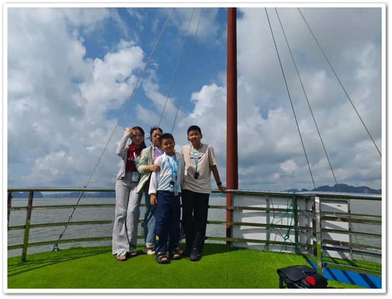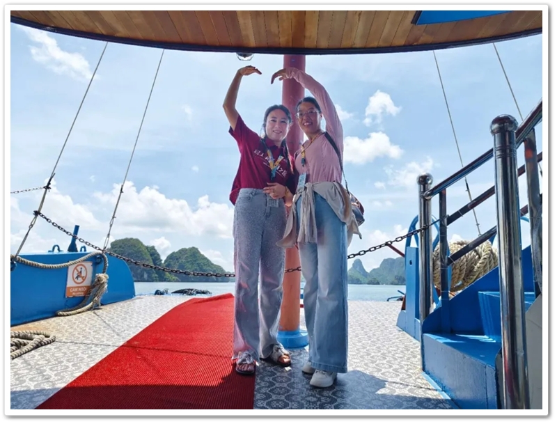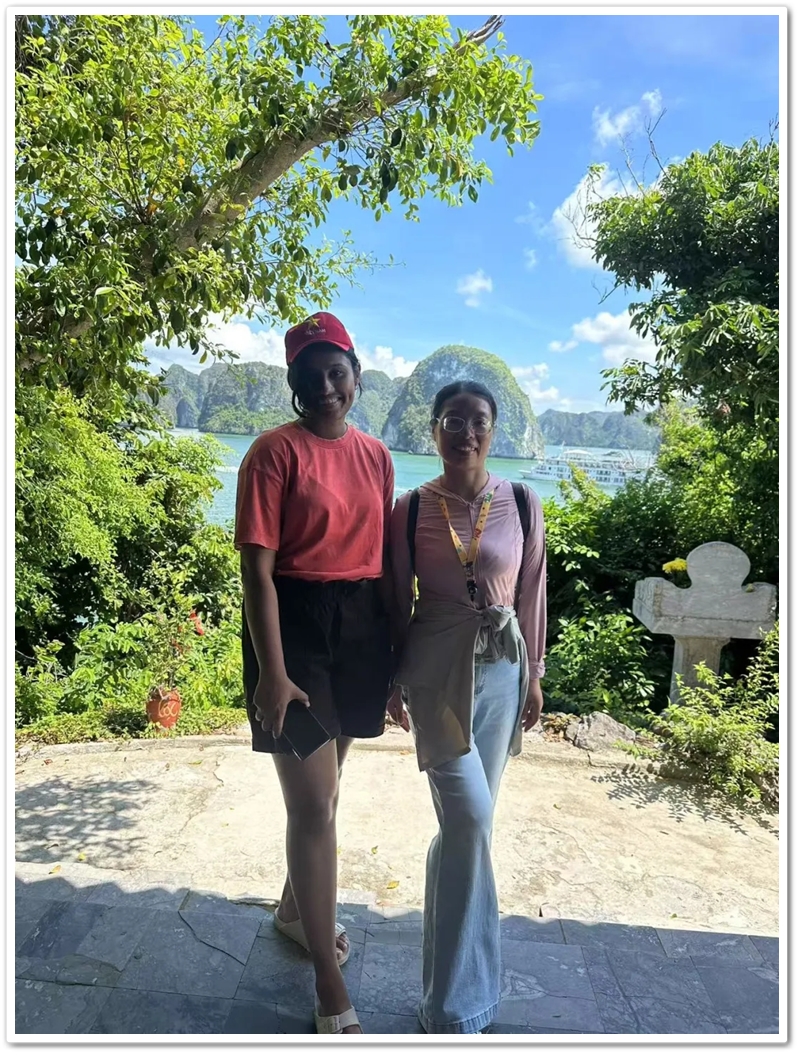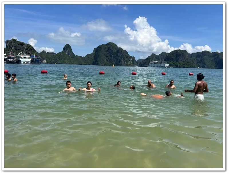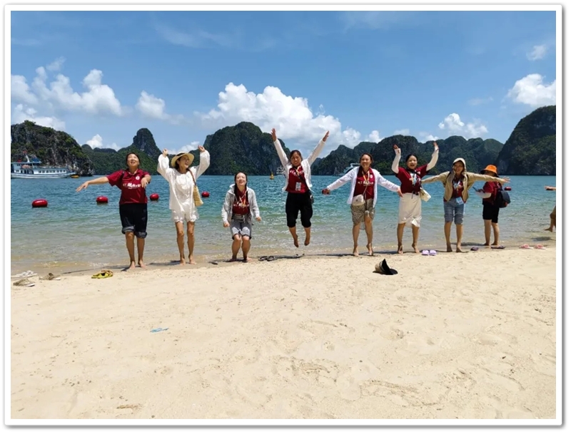 餐后,游船直抵天堂岛。望见那片澄澈蔚蓝,众人难抑兴奋:“大海,我们来了!”沙滩瞬间跃动起欢腾的身影。有人纵情投入浪花怀抱,有人嬉闹追逐于细沙之上;更有勇者不畏高,沿石阶奋力登顶。立于高处豁然开朗,俯瞰碧水环绕、千峰竞秀,下龙湾壮景如诗如画铺展眼前。下山途中偶遇异国游人,英语教师Miss He主动攀谈。快门轻按,瞬间绽放的国际友谊之花,为旅程再添温情。