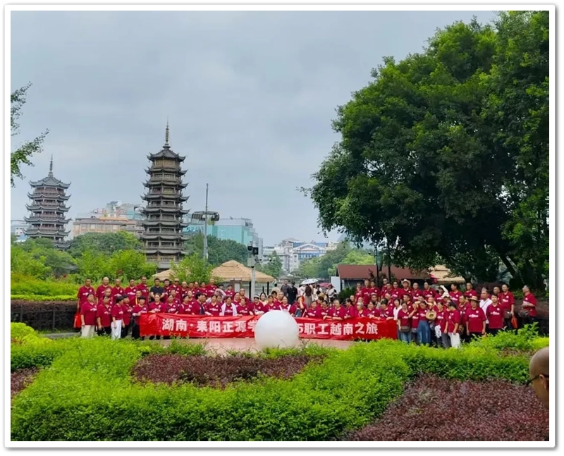 移步榕杉湖畔,古榕苍翠、湖光潋滟。行至日月双塔前,大家以塔为幕,合影留念,并高呼心中所感:“桂林山水甲天下,正源学校福利多!”铿锵之声回荡湖畔,一张张笑脸与金铜双塔同框,定格成团队凝聚力的最美见证。