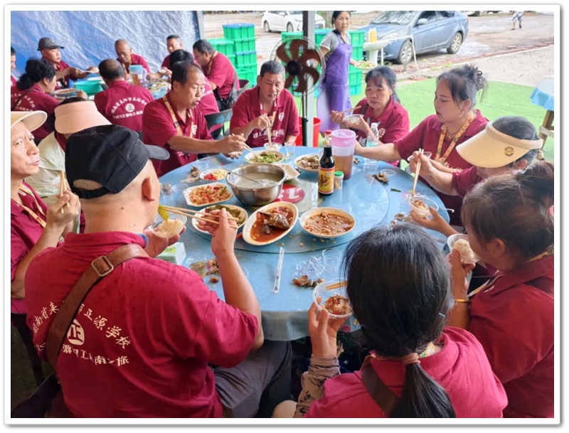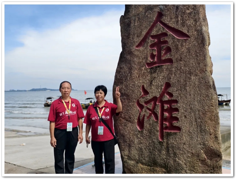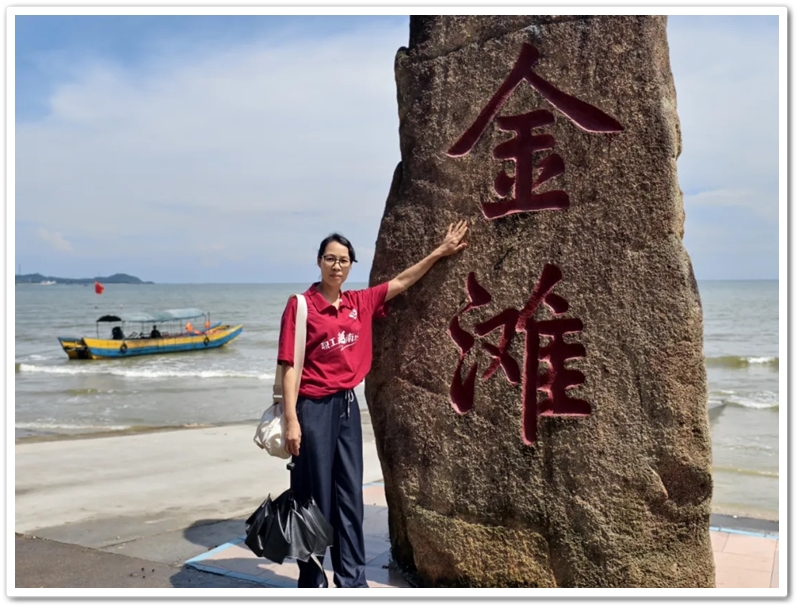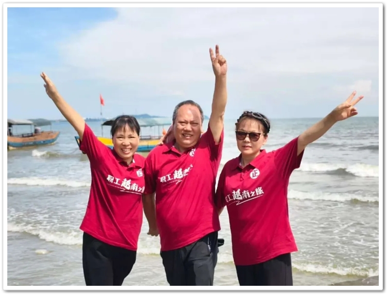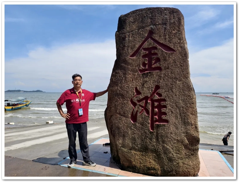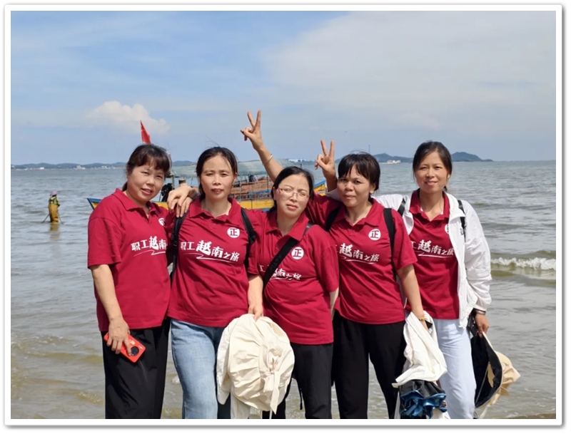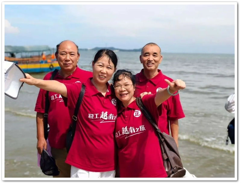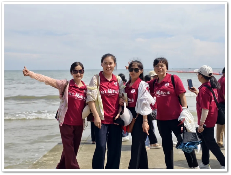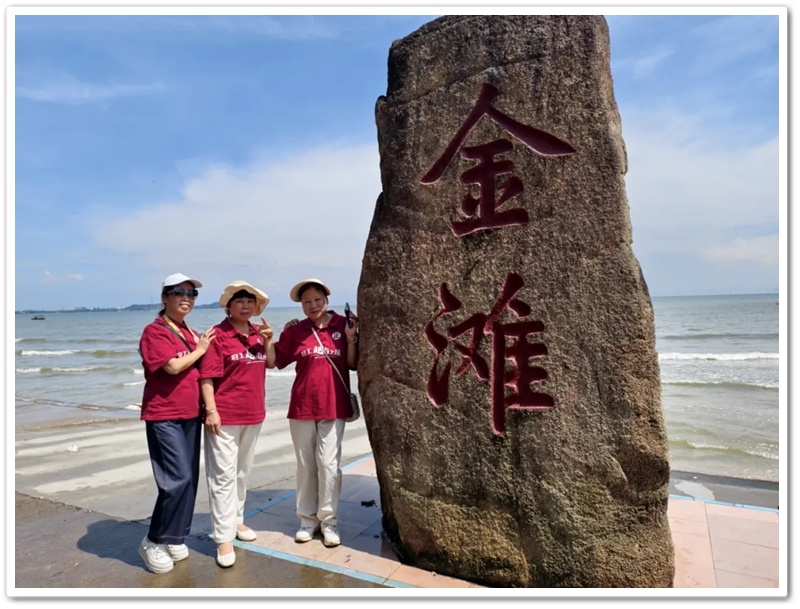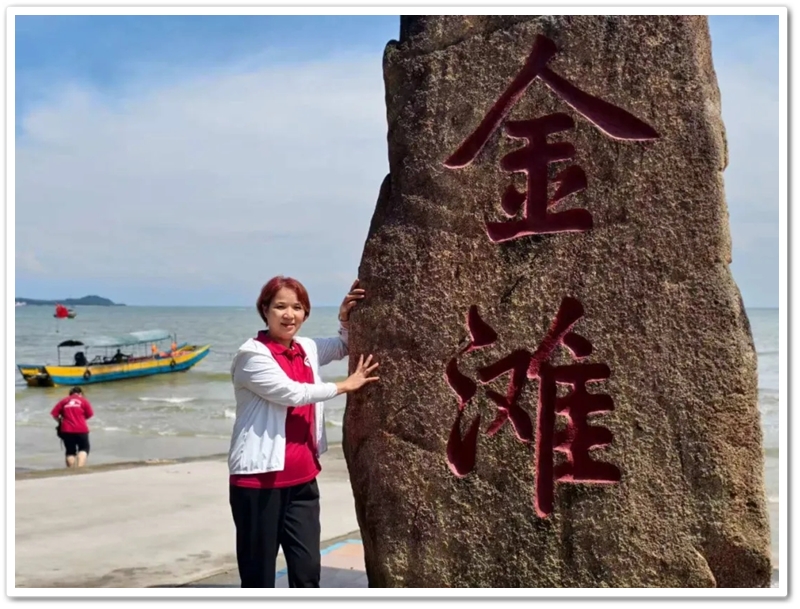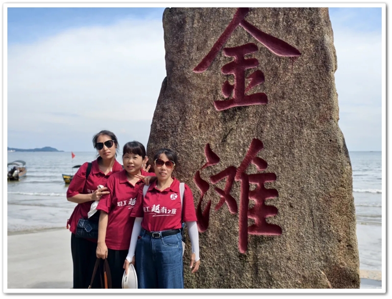 下午两点十分,旅游车停在东兴市万尾金滩边的餐馆前。刚推开车门,海风裹着海鲜的咸香扑面而来,餐馆老板系着油亮的围裙在门口迎客:“刚出锅的虾婆,要不要先尝两只?”餐桌上,麻婆豆腐的红油泛着亮光,素炒白菜带着清甜,香煎鸡尾虾的壳脆得能嚼出声响。一位生活老师夹起一只虾,边剥壳边说:“这虾比咱们菜市场的鲜多了,回头得带点干货。”平时大家吃饭较早,而今天到下午两点才开餐,看到满桌的特色佳肴,大家早已垂涎三尺,迫不及待,一个个津津有味地咀嚼着,有些同志不到十分钟就用餐完毕。先吃完的几个女同志迅速走到海边那块刻有“金滩”字样的石碑前,摆出各自认为最美的造型,让同伴帮他们用手机拍下了美好的回忆。见女同志争先恐后留影,男员工也跃跃欲试。旅游总领队蒋智敏助理见大家兴致颇浓,连忙掏出手机,用他专业的摄影水准帮各位职工定格下了此刻的美好。单照过后,总领队蒋又招呼大家聚在“金滩”石碑周围,给我们的团队留下了今天的第一张大合影。
