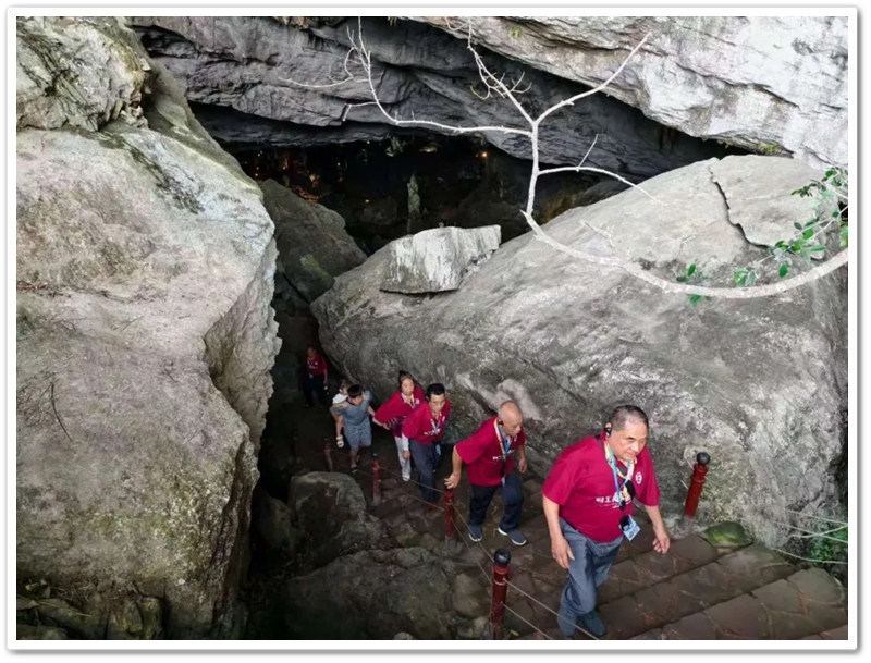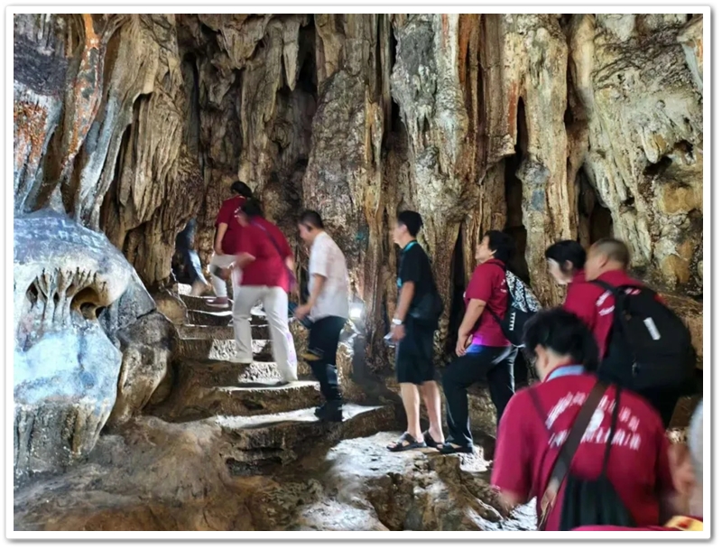 踏上通往溶洞的石阶,脚下的灰岩被千万人的脚步磨得温润。石阶陡峭如攀龙鳞,每一步都伴着海风穿过岩缝的轻吟,待攀上中间的观景台,大家放眼俯瞰,被眼前的胜景迷住,连忙呼唤蒋助理,蒋助理用手中的相机留下了大家难忘的瞬间。登上顶端再俯身下坡,一股清凉便从幽暗处漫来——天然溶洞的入口正吞吐着湿润的气息,像巨龙微微启齿。
