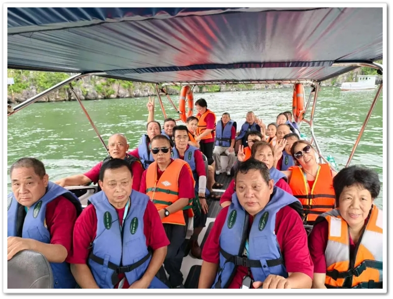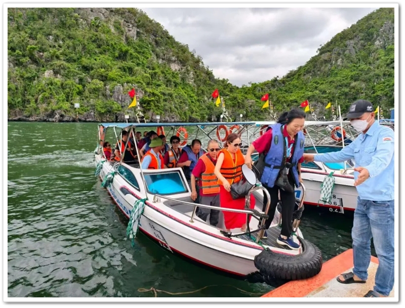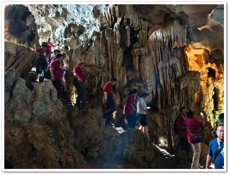 换乘手划木船后,节奏骤然放缓。船桨搅碎水面天光,涟漪里晃着两岸峰影。行至洞口,低矮得需俯身,仅容两船并行的缝隙中,潮气混着草木香扑面而来。忽然,对面小舟上的华人面孔映入眼帘,“你们是哪里的?”“我们是台湾的。”回应刚落,“台湾也是中国的!”我们船上有人脱口而出,那边立刻清亮附和:“对,中国的!”两船相错的瞬间,目光交汇,暖意漫心,在大家心中,此刻台湾似乎已然回归祖国母亲的怀抱,这窄洞也仿佛成了连接血脉的纽带。