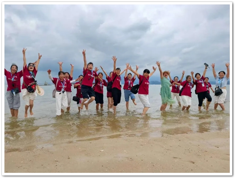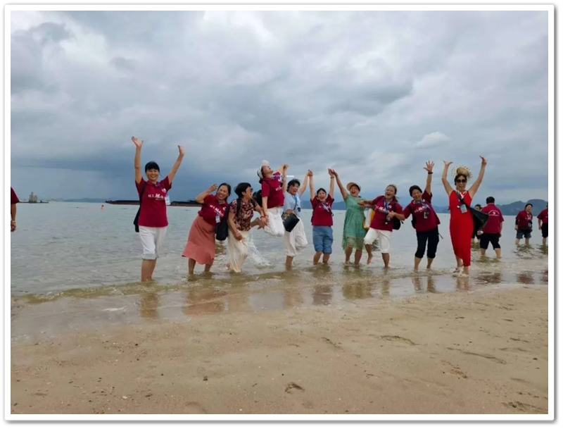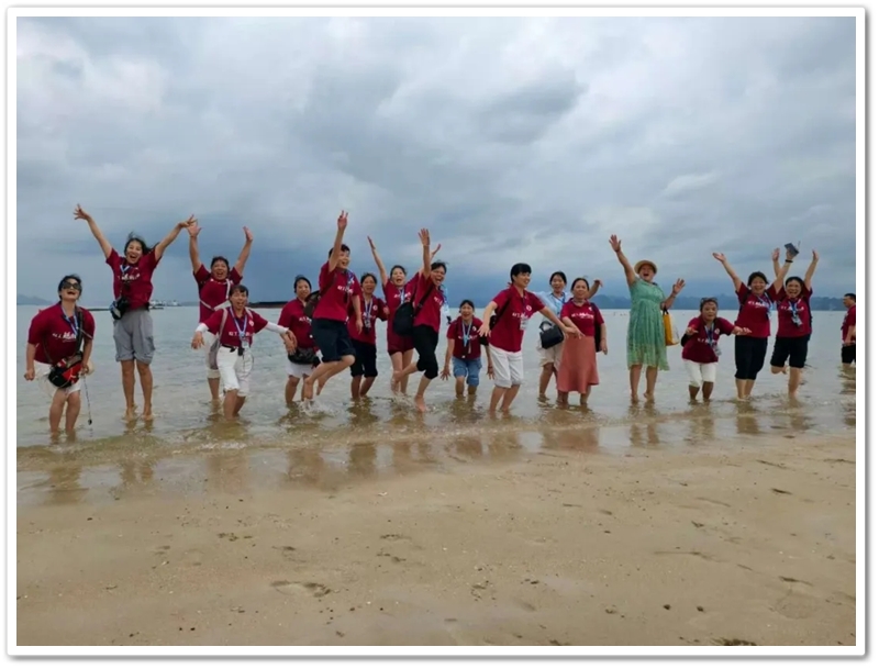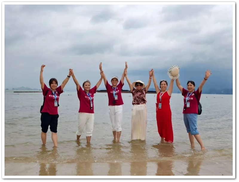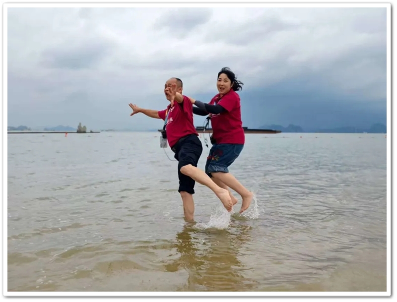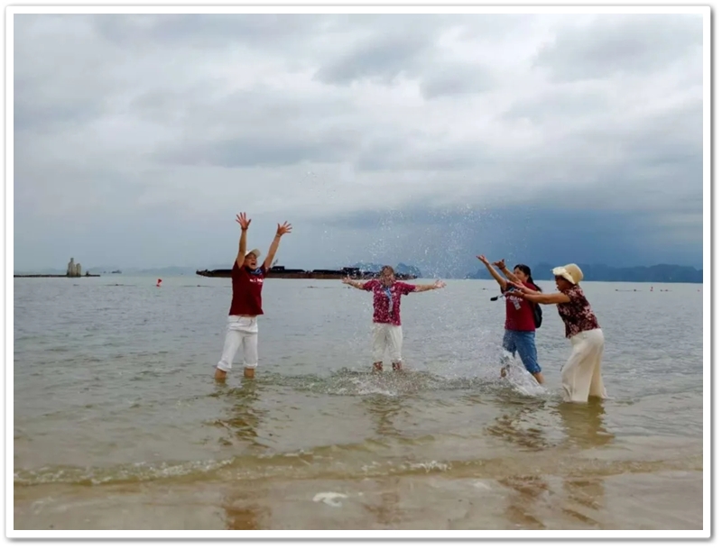 从月亮岛返回游船,中餐香气混着海风萦绕。简单用餐后,船行20分钟,金色海滩在阳光下铺开。众人脱鞋赤脚踩沙,暖沙从趾缝漫过,痒意裹着惬意。海浪卷起白沫漫来,刚触脚踝又退去,带起细碎沙响。有人追浪奔跑,被退潮海水拽得趔趄,惹来一片笑;有人蹲身拾贝,白扇贝壳映阳光,流转虹彩;有人举起手机转圈,想把蓝天碧海、金滩与笑脸全框进镜头。