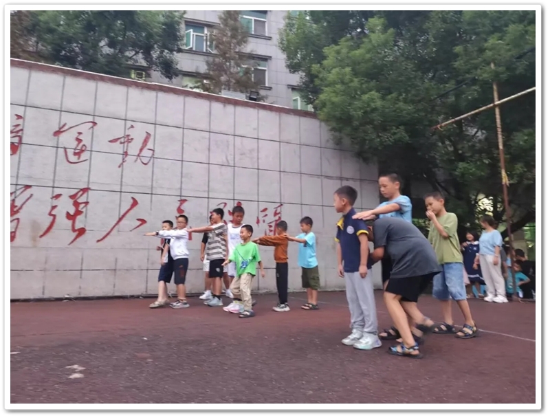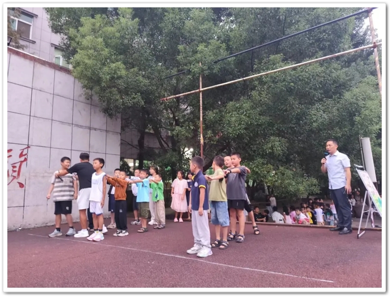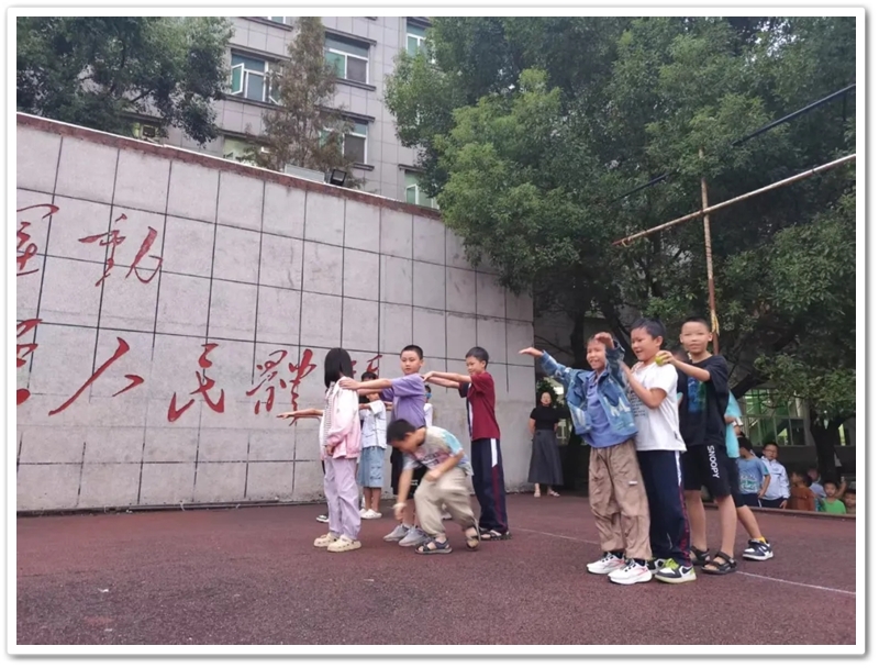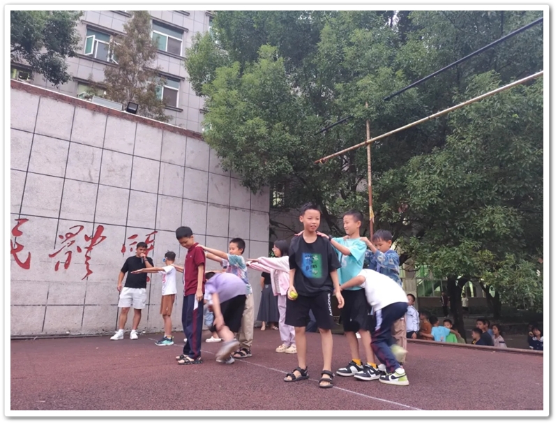 在热烈的掌声中,主持人宣布进入第一个游戏环节——穿越丛林。体育老师肖老师给大家介绍游戏规则:每次共分为三组,每组四人;每组同学排成一列纵队,后面的同学双手伸直搭在前一位同学的肩上,形成一个“人体长龙”;比赛开始后,每组最后一位同学要以S形走位,从后往前依次钻过同学们搭肩形成的“丛林过道”,且不能漏钻,钻到最前面后成为新的排头,后面的同学依次重复动作,直至最后一位同学超过终点线,用时最短的队伍获胜。