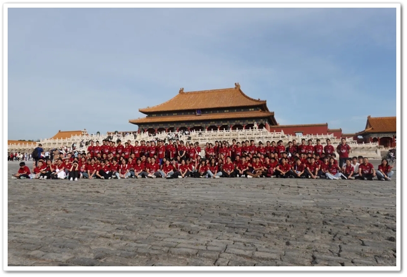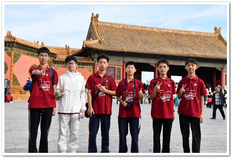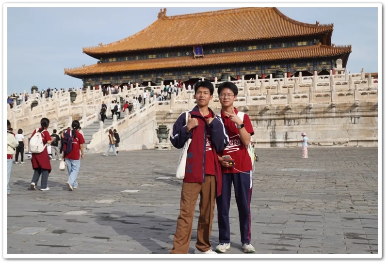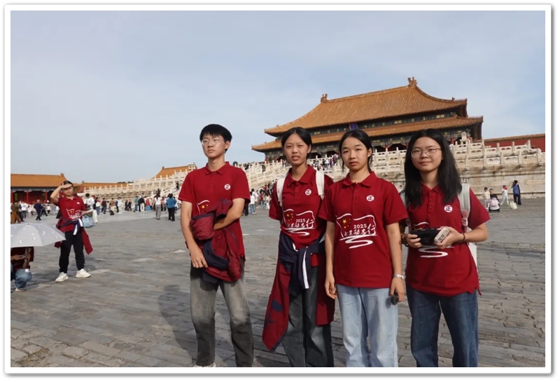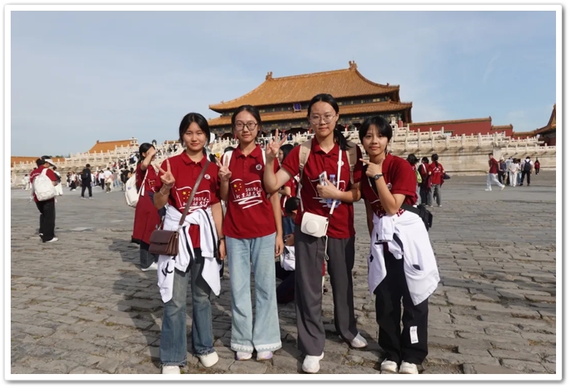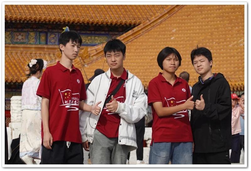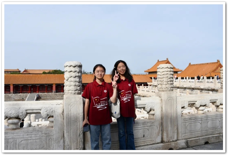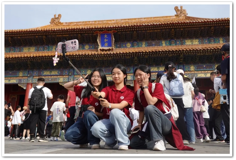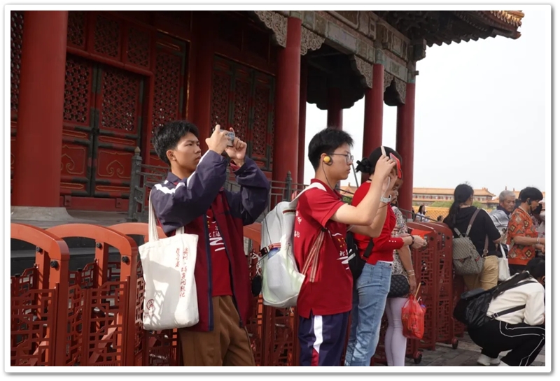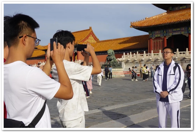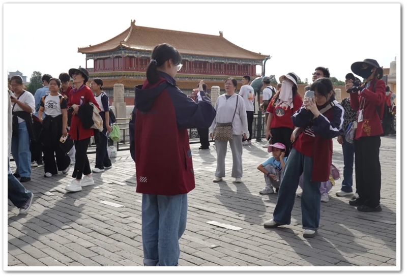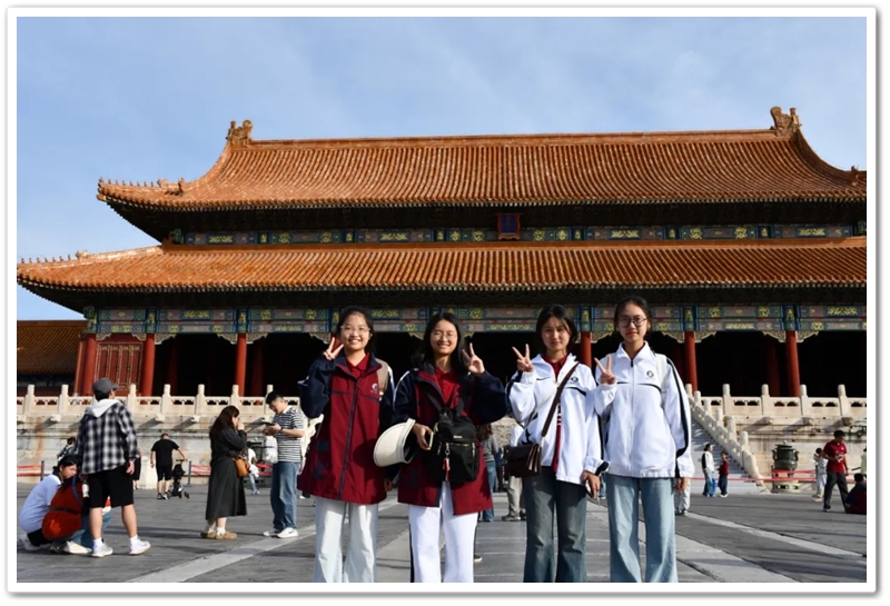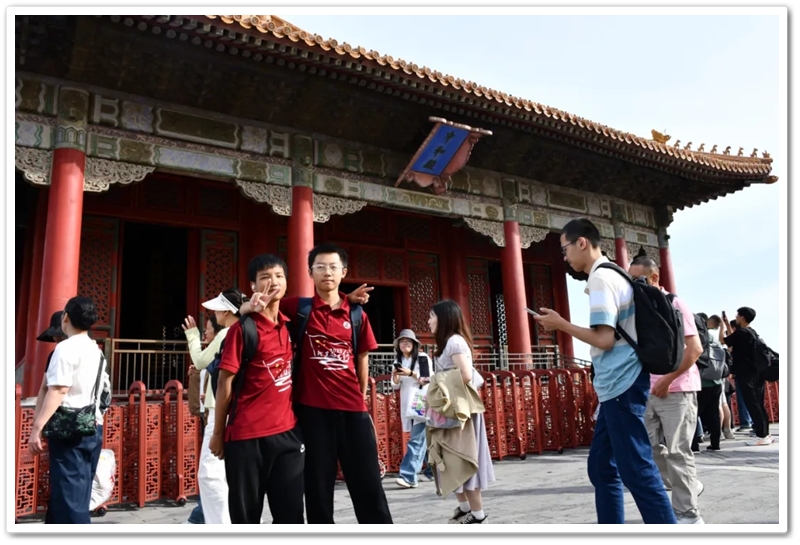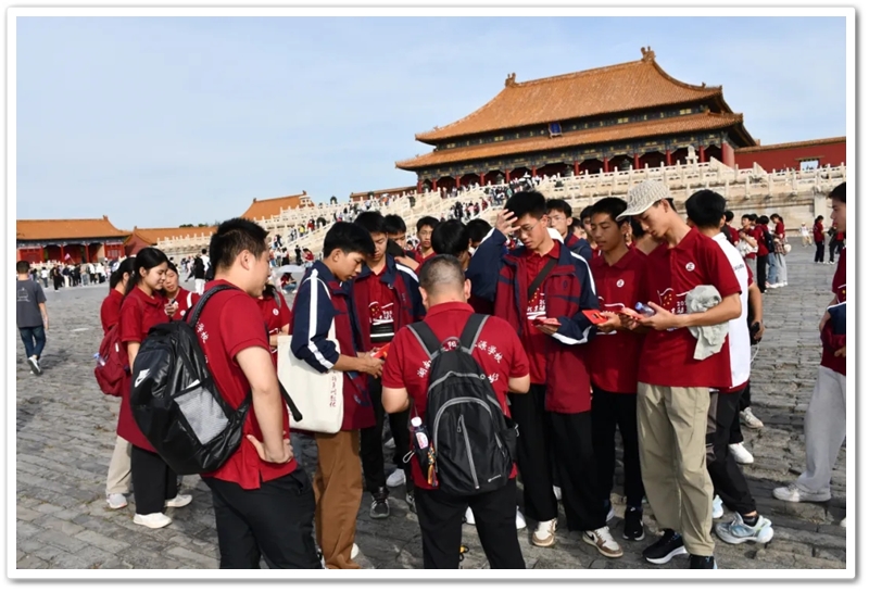 升旗仪式落幕,同学们稍作休整,继而前往故宫博物院。穿过午门,红墙黄瓦映入眼帘,六百年历史厚重感扑面而来。太和殿前,铜狮昂首,汉白玉栏杆龙纹精巧,气势恢宏。太和殿下,173位正源学子列队集结,红衣飘飘,青春飞扬。