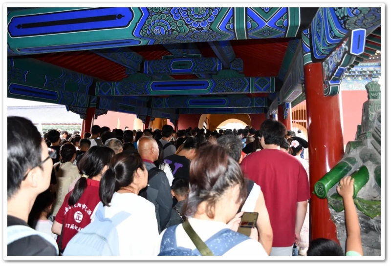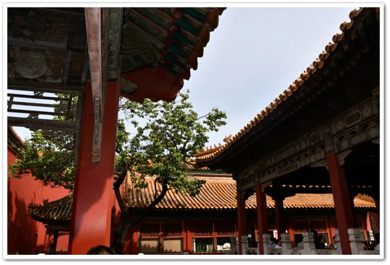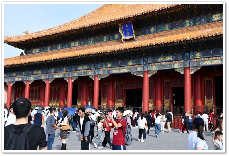 沿着故宫的中轴线缓缓前行,中和殿的四角攒尖顶、保和殿的重檐歇山顶、乾清宫的“正大光明” 匾额、交泰殿的鎏金铜狮、坤宁宫的朱红大门依次映入眼帘,每一处建筑都独具特色,诉说着不同的故事。殿宇巍峨高大,飞檐翘角向上翘起,似要展翅腾飞,飞向云霄;雕梁画栋上,彩绘的龙凤、祥云色彩依旧鲜亮,红色、蓝色、黄色交织在一起,虽历经百年风雨,却仍能让人想见当年的繁华盛景。御花园内,古柏虬枝盘曲,光影斑驳,石凳小憩间,欢声笑语为古老宫殿注入青春活力。当穿过御花园,即将作别神武门时,大家忍不住回头望去,红墙黄瓦在暮色中依旧庄重肃穆,心中满是不舍,脚步也不自觉地慢了下来。