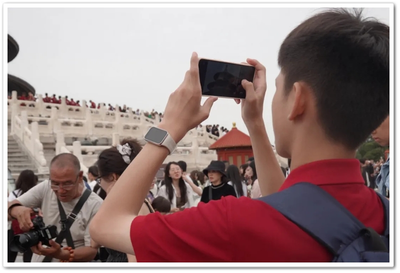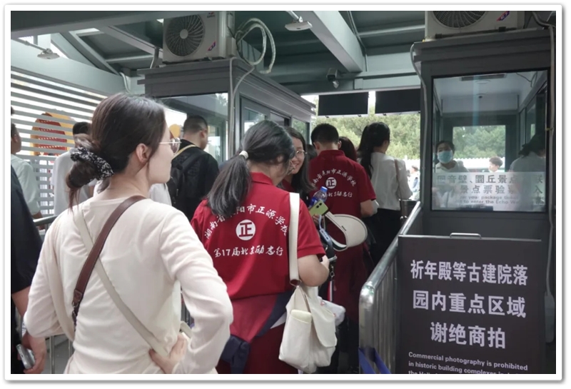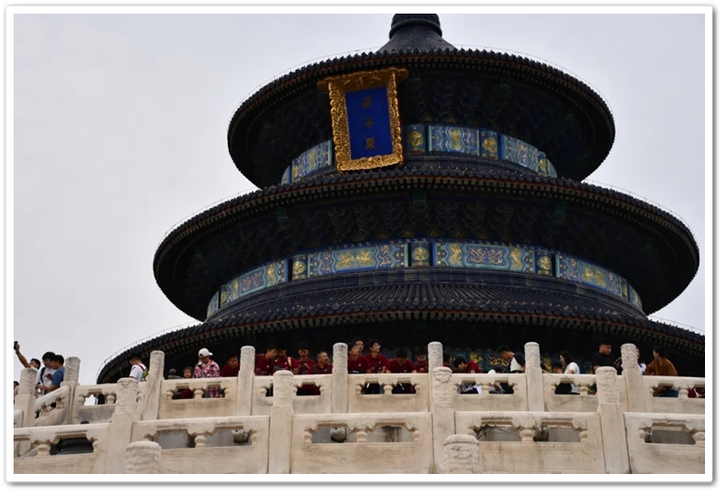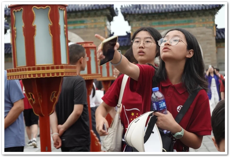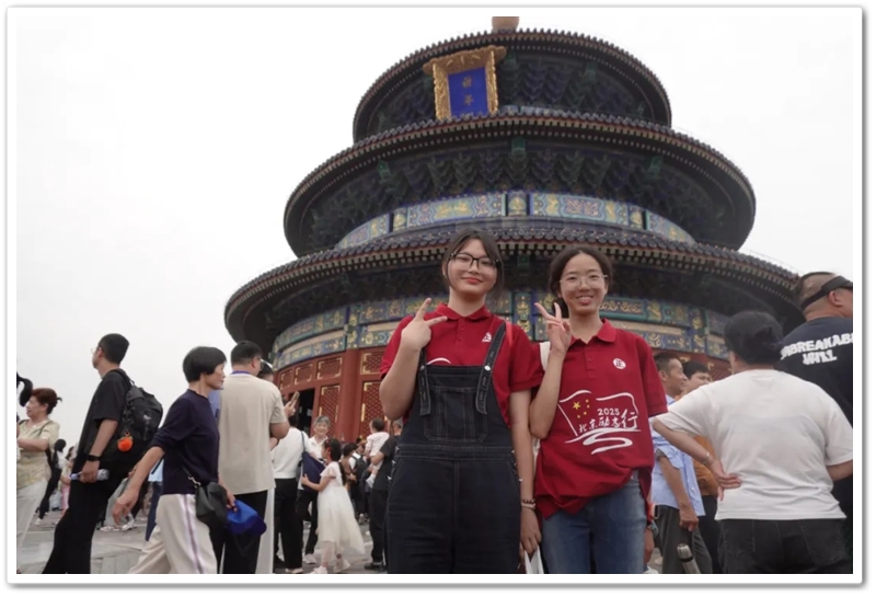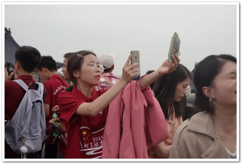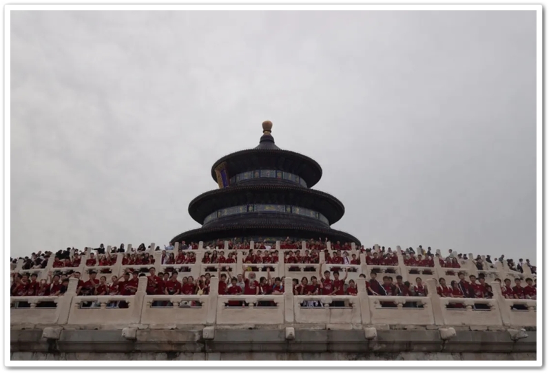 下午四点半,两队学子作别博物馆,于天坛公园汇合。祈年殿上,红墙金顶与白玉栏杆交相辉映,“正源红”置身其间层“林”尽染,定格美好瞬间。沿丹陛桥前行,古柏郁郁葱葱,枝叶间阳光洒落,尽显清幽。圜丘之上,夕阳的余晖为汉白玉栏杆镀上了一层金色,栏杆上的纹路在光影中若隐若现。回音壁前,“隔墙对话” 嬉戏,欢声笑语回荡。随着时间的推移,夜色渐渐变浓,祈年殿的灯光缓缓亮起,暖黄色的光线照亮了红墙金顶,在深蓝色的星空下显得格外庄严。