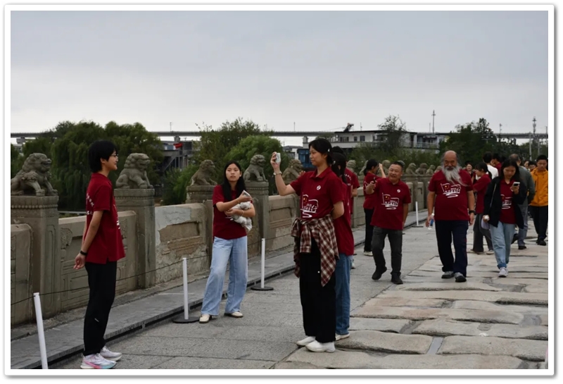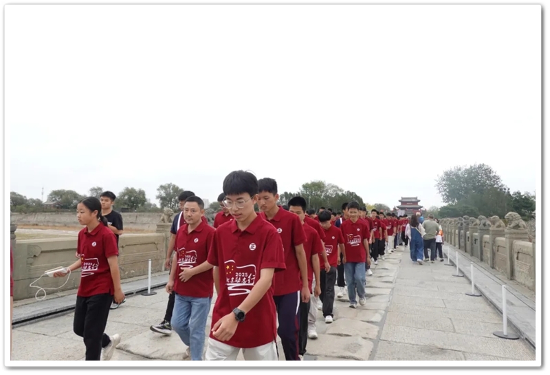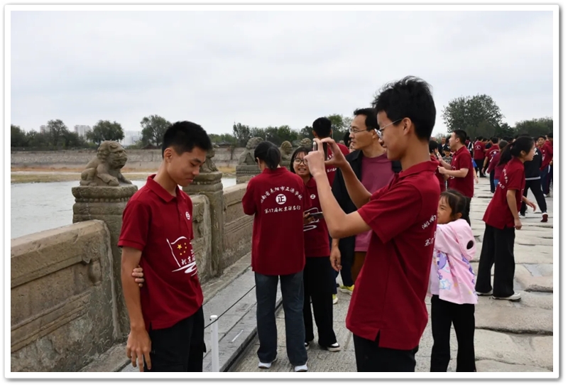 正午时分,带着歌声里的激荡心情,师生们一鼓作气穿过宛平城,直奔卢沟桥。秋日的阳光洒在桥面的坑洼石板上,那些深浅不一的痕迹,是岁月留下的历史刻度;栏杆上的石狮历经百年风雨,有的昂首挺胸似在警惕外敌,有的凝视远方似在守望和平,桥下永定河水缓缓流淌,仿佛在诉说着88 年前 “七七事变” 的悲壮往事。同学们排成两行纵队,昂首挺胸迈上桥面,脚步踏过的每一块石板,都承载着中华民族刻骨铭心的集体记忆。