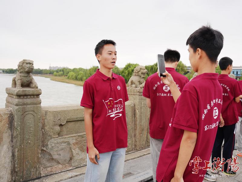 ▲学生在卢沟桥上互相“采访”,畅谈此行的感受。