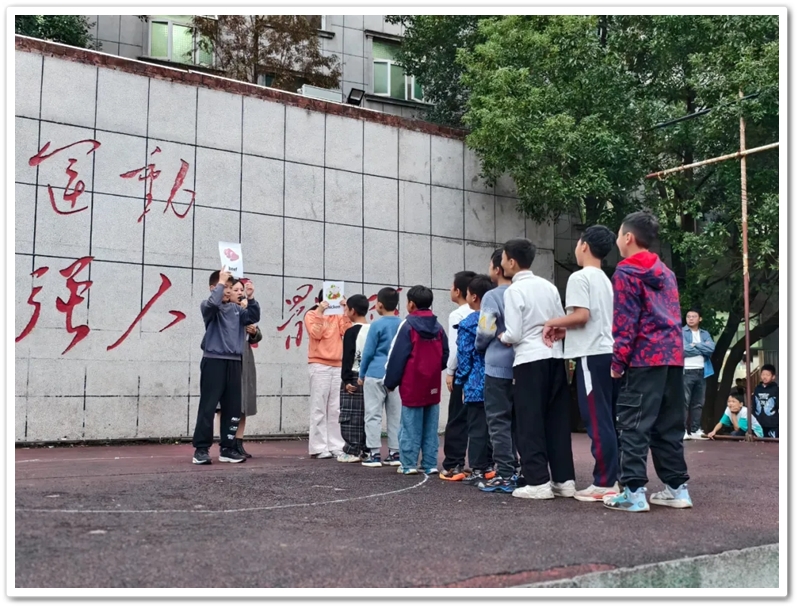 随后,贺鸿媚老师拿着话筒走上台,刚说出“第一个游戏是单词蹦蹦跳”,台下立刻举起一片小手,连坐在花坛边的同学都蹦起来举手:“贺老师,我来!我来!”最终选出的10人小组,挺直腰板站成一列,眼睛紧紧盯着贺老师手里的单词卡片。“苹果!”指令刚落,孩子们几乎是脱口而出“apple”,脚步“哒哒哒”地飞快跳向标着“苹果”的区域,有个小男生慌得差点踩错线,赶紧退回来调整姿势,吐吐舌头的模样惹得全场笑作一团。一轮轮淘汰后,二年级476班的李泽熙始终稳稳接招,当听到“最后获胜的是李泽熙”时,他兴奋地举起小拳头欢呼,还不忘回头跟台下的好朋友比了个“耶”,满是胜利的骄傲。