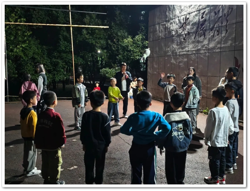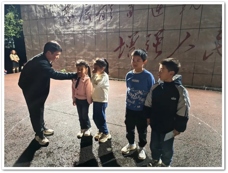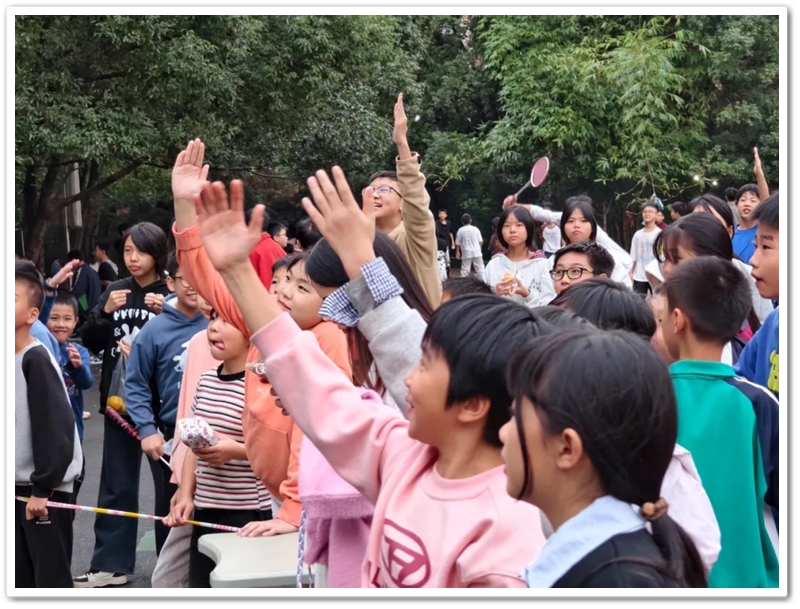 肖文敏老师带来的两项游戏,则将“协作与专注”的成长课题藏进了欢乐里。“反应力大挑战”开始前,他特意弯下腰来跟小选手们说:“仔细听指令,别着急,慢慢跳。”20人围圈站定,耳朵像竖起来的小雷达,“里!”指令刚出,孩子们齐刷刷往圆圈中心跳,动作快得像灵活的小兔子;“外!”又立刻往后退,有个小女孩没反应过来,还站在原地,自己先笑了:“老师,我错啦!”乖乖走到台下当起观众,还不忘给台上的同学加油。而“左右为难”游戏里,传递布娃娃的瞬间最是紧张——肖文敏老师刚说“开始”,柔软的布娃娃就在孩子们手中传递,接娃娃的同学刚伸出手,左右同伴就得立刻蹲下,稍有迟疑便会淘汰。478班的刘柏君、张绅宇、罗子涛三人配合得格外默契,刘柏君传球时,张绅宇和旁边的同学立刻蹲下,张绅宇再传给罗子涛,动作像提前排练过一样流畅。当最后只剩下他们三人时,台下同学的欢呼声差点掀翻暮色,三人接过奖品时,还互相击了个掌,眼里满是“我们做到了”的自豪。