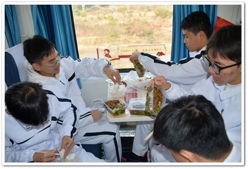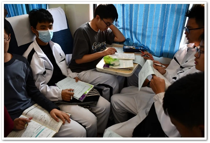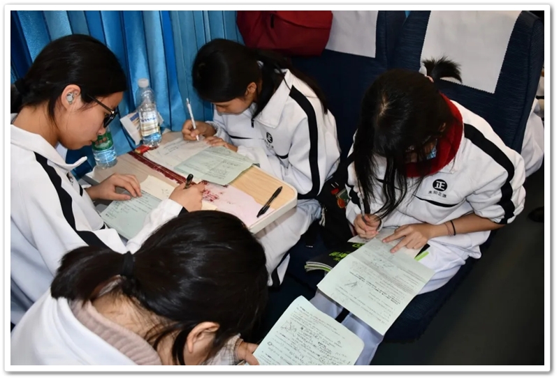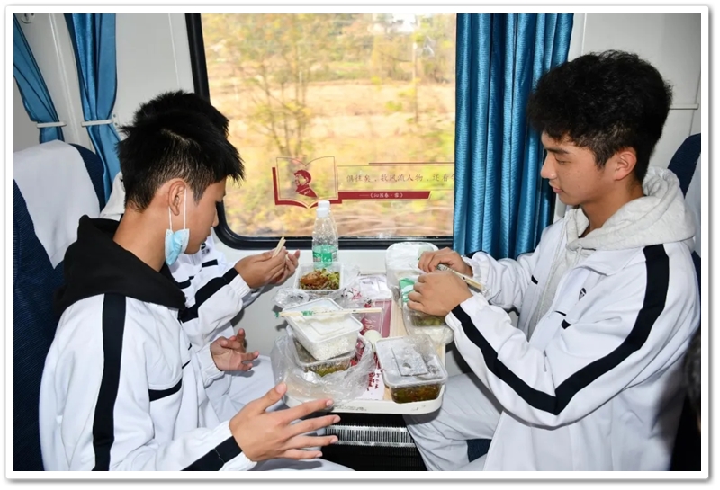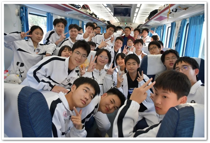 长达数小时的车程,不仅是地理空间的位移,更是历史纵深的心路。在“我的韶山行”专列上,我们温习誓词,齐背誓词,我们齐唱《没有共产党就没有新中国》,我们高歌《强军战歌》,我们勤奋努力……歌声在列车上飘荡,笔尖在作业上描画,青春的光芒溢满每一节车厢,奋斗的力量写满每一张稚嫩的脸庞。特别是第一批专列4号车厢,371班、372班和373班学生们精神饱满,严肃活泼,听从指挥,井然有序,得到了同行上级领导的高度赞扬;第二批专列356班至364班更是如此,列车工作人员说:“这批孩子不得了,不是在读书就是在写作业,第一次见到。”