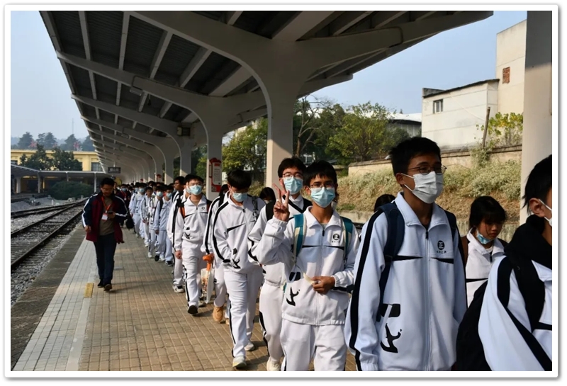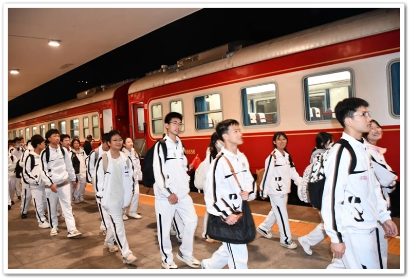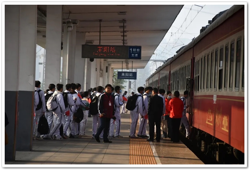12月10日5点40分,天光破晓,晨星在肩。美丽的正源学校校园已经苏醒,蓄势待发之心驱散了微凉寒气,高一年级1423位学生已经起床,56位老师已经就位,第三食堂员工早已准备好了早餐和学生的中餐盒饭。6点40分,第一批翩翩少年就出发了;7点20分,第二批学生集合,经过简短动员讲话后,举行了授旗仪式,7点55分登车出发。满载青春身影的大巴车,从学校启程前往耒阳火车站。车轮滚滚,驶离熟悉的校园,向着“红太阳升起的地方”坚定前行,困倦烟消云散,嘹亮的歌声荡漾心头,“东方红,太阳升”“数风流人物,还看今朝”……我们一路向北。