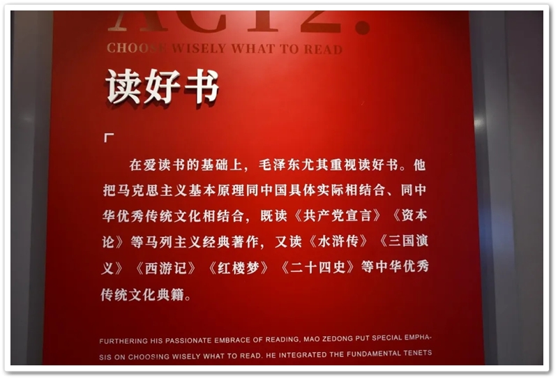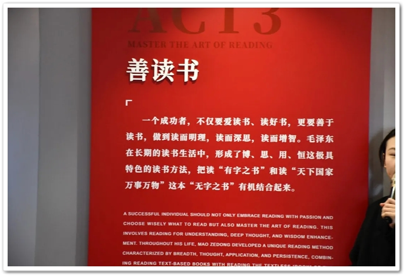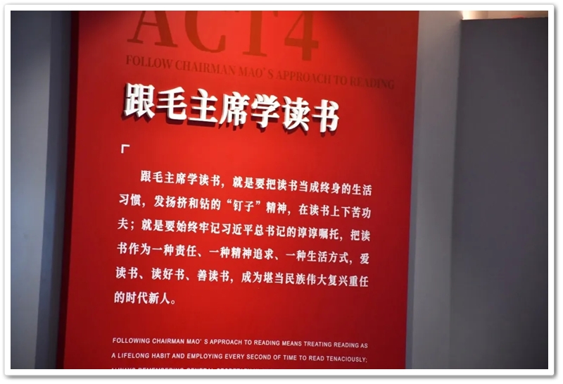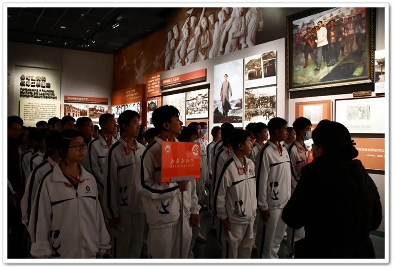 我们从“韶山少年”毛泽东的足迹开启探索,一个心怀天下、不甘平凡的乡村少年形象跃然眼前;我们跟随青年毛泽东辗转求学,“目睹”了他面对世界地图,凝神思索,体悟了他胸怀寰宇,立志探索救国真理……讲解员娓娓道来:毛泽东傲立时代潮头,反复求索实践,最终寻得马克思主义真理,立志改造中国与世界……一步步人生的脚印、一回回思想的蜕变、一次次历史关头的挺膺担当,都生动地呈现在我们的眼前,都直接叩击着我们的心灵。