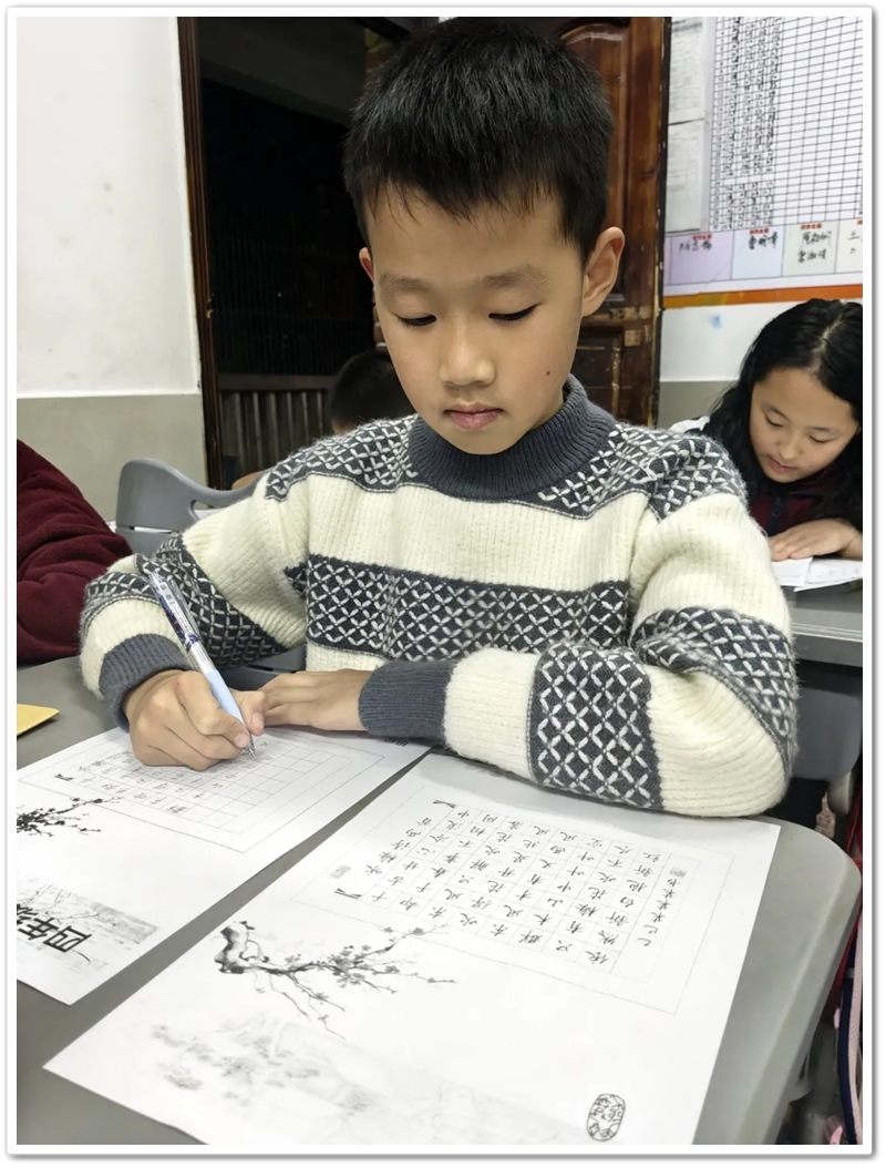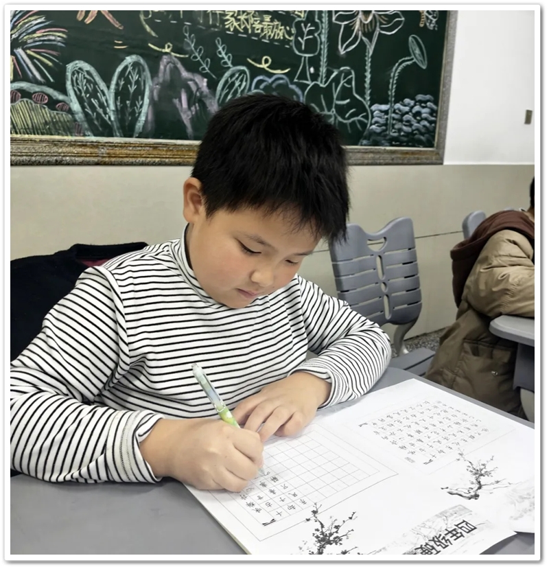 放眼望去,同学们都保持着“头直、身正、臂开、足安”的正确坐姿,握笔的手稳而不僵,运笔的动作轻而不浮。有的同学眉头微蹙,目光紧紧锁定纸面,一笔一划都斟酌再三,仿佛每一个笔画都承载着对汉字的敬畏;有的同学则下笔干脆利落,手腕灵活转动,横平竖直间尽显自信;还有的同学则左手轻轻按住纸张,右手紧握笔杆,小小的身子坐得笔直,眼神专注得像一颗小星星,生怕写错一个笔画。