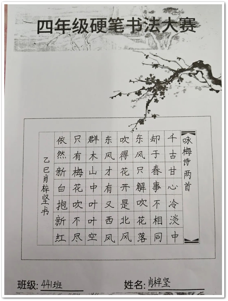 监考老师们穿梭在课桌间,目光里满是欣慰。谢老师看着441班同学们笔下渐渐成型的作品,轻声感慨:“孩子们的进步太明显了,从握笔姿势到笔画结构,都越来越规范了。”