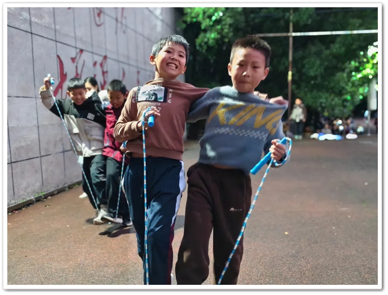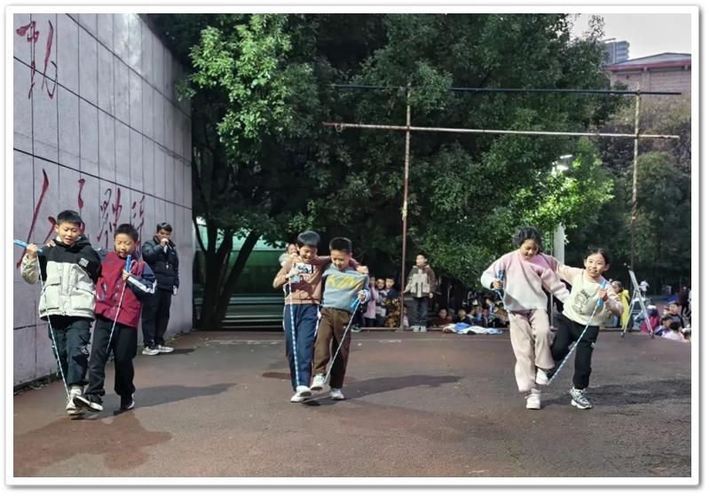 第一环节的体育游戏“同绳共进”由肖文敏老师组织。一声哨响,参赛的孩子们迅速肩并肩站成一排,将长长的跳绳紧紧握在手中。二年级478班黄智慧喊着响亮的节拍:“一二!一二!”带领贺靖雯步调一致向前跃动;一年级486班徐子晨脚下不小心踉跄,却立刻稳住身形跟上节奏,引得队友大声鼓劲,呐喊声、加油声、欢笑声交织在一起,成了校园里最动听的旋律。最终,五年级423班的曹丽妍和欧阳雨橙胜出,喜获奖品。