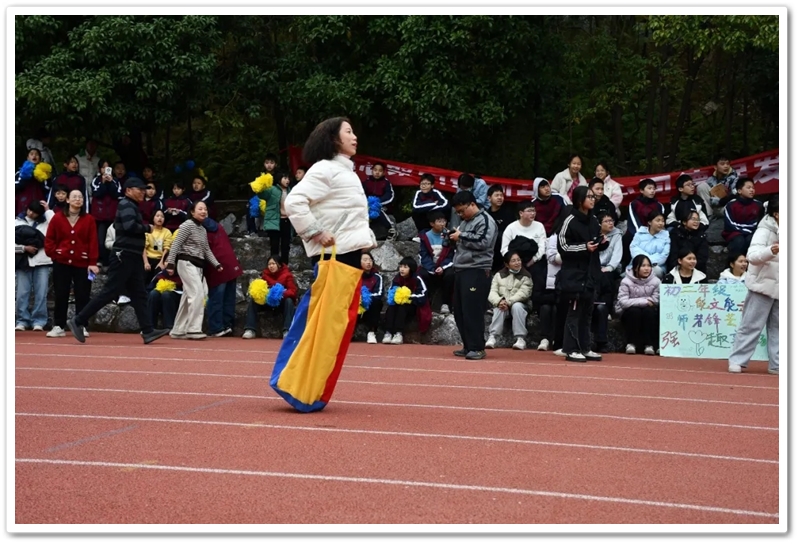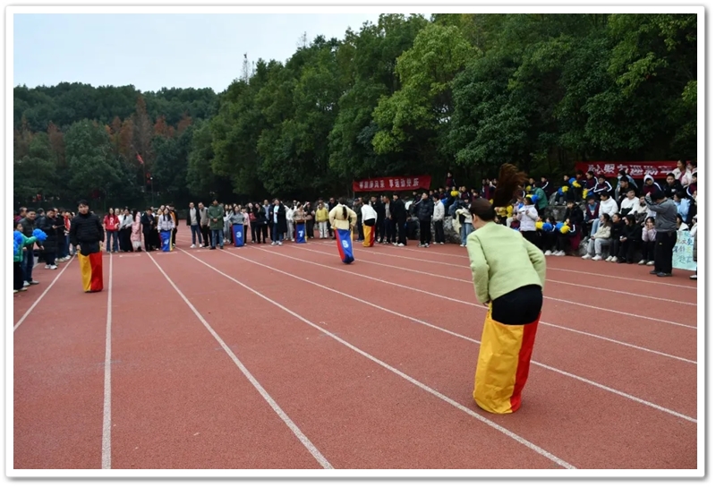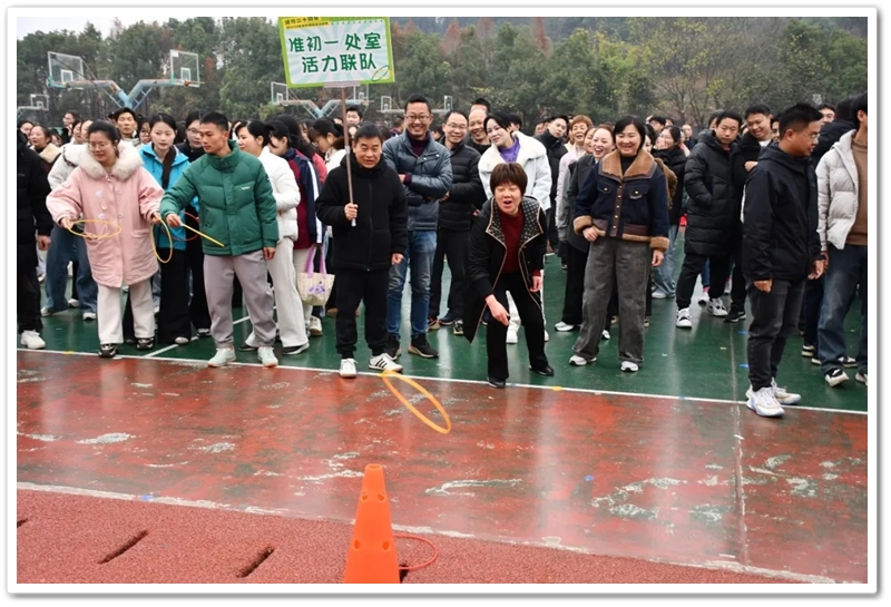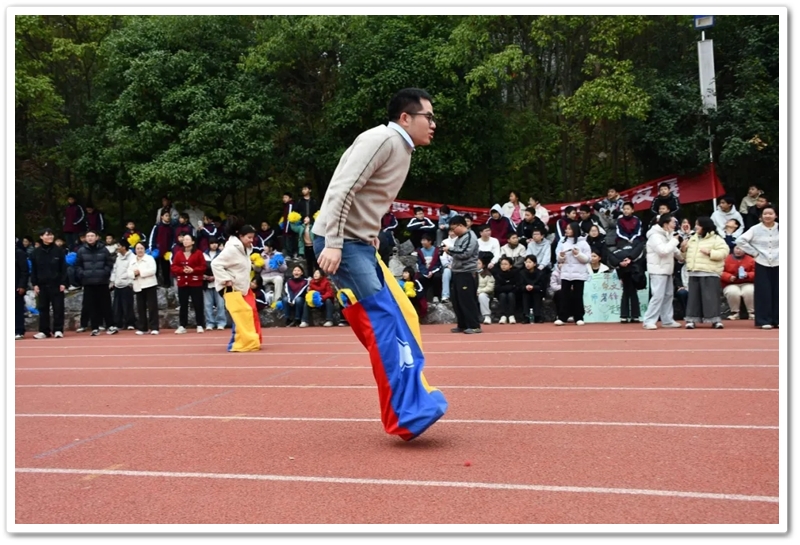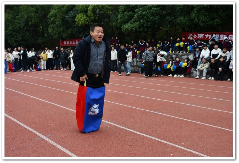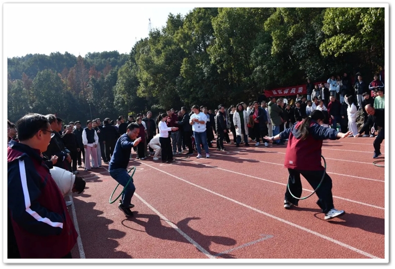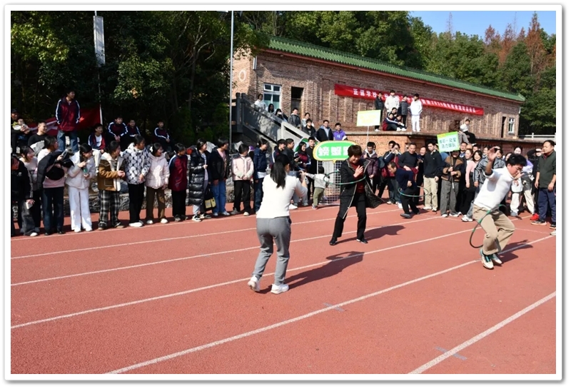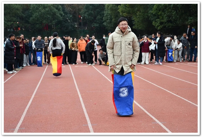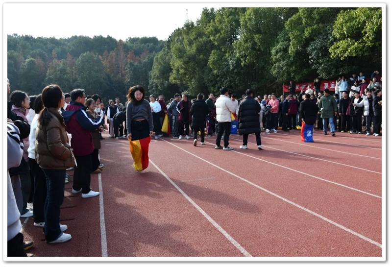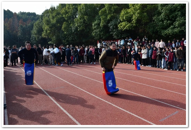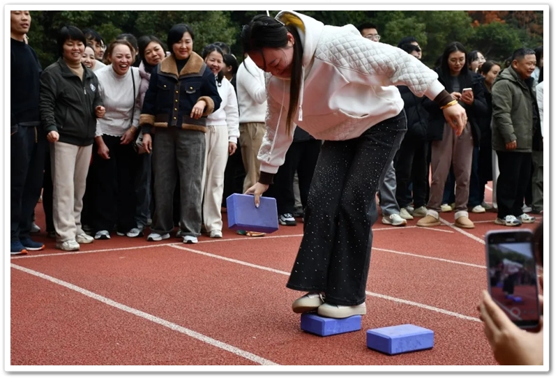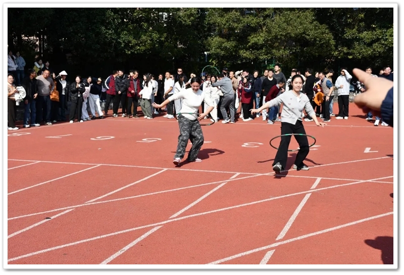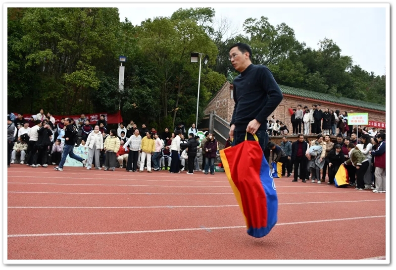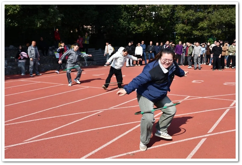 赛场上,各项趣味项目亮点纷呈、妙趣横生。“精准套圈王”既要眼准手稳,还要一点运气加成。老师们屏气凝神瞄准目标,每一次套中总要引发一场欢呼雀跃,实力与运气的碰撞让赛场氛围瞬间升温。“袋鼠跳”项目中,老师们身着布袋、手脚协同,找准节奏方能游刃有余,蹦蹦跳跳飞速前行。“摸石头过河”项目则将难度拉满,踩着道具石块稳步挪进,稍有不慎便会趔趄失衡,一个“连滚带爬”,引发全场欢笑;“腰缠万贯”项目考验着团队间的默契配合,一不小心就要撞个满怀;“螃蟹跑”项目要双腿顶着呼啦圈侧身前行,老师们手忙脚乱的姿态与奋力冲刺的模样形成鲜明反差,又让众人忍俊不禁……掌声与欢笑交织,运动场内俨然化作一片欢乐的海洋。