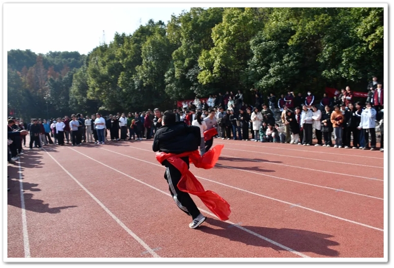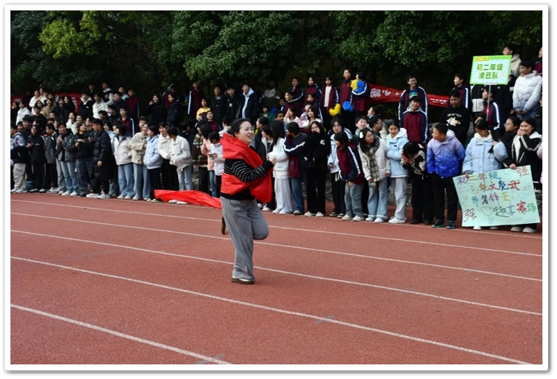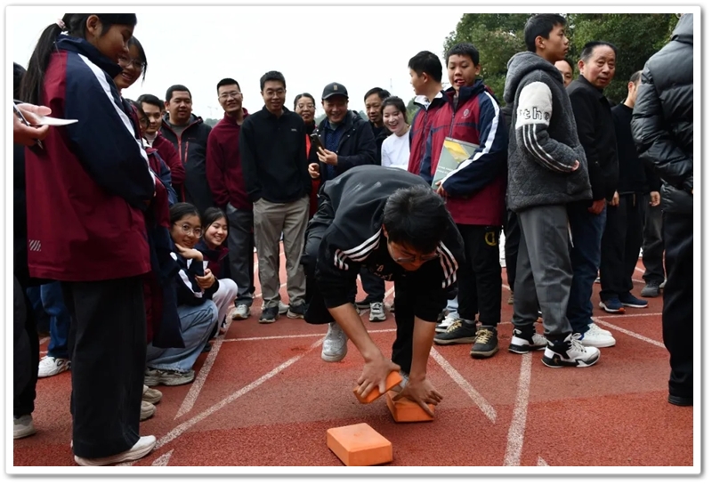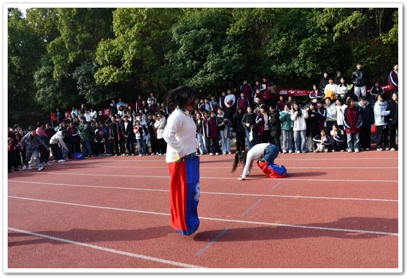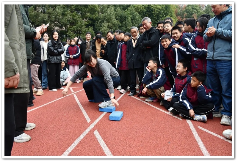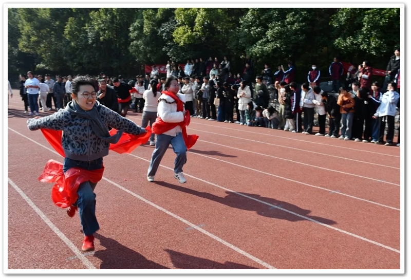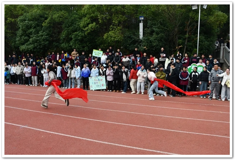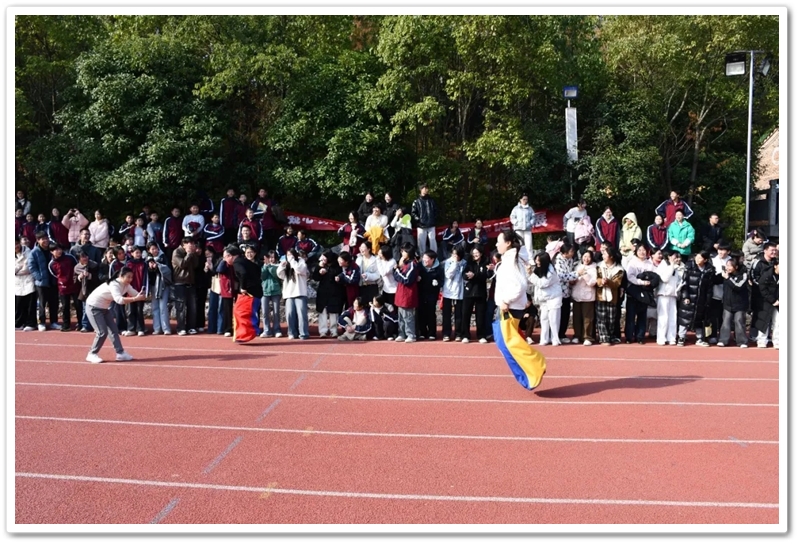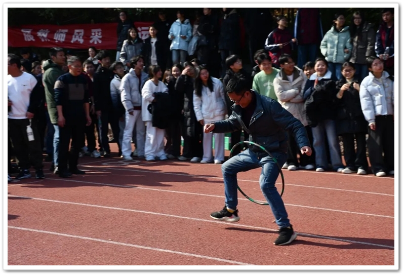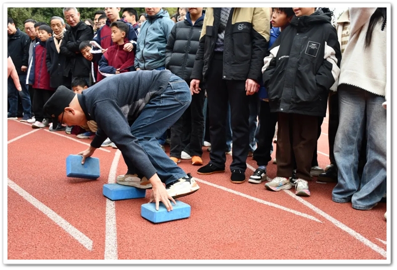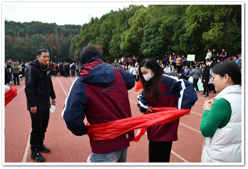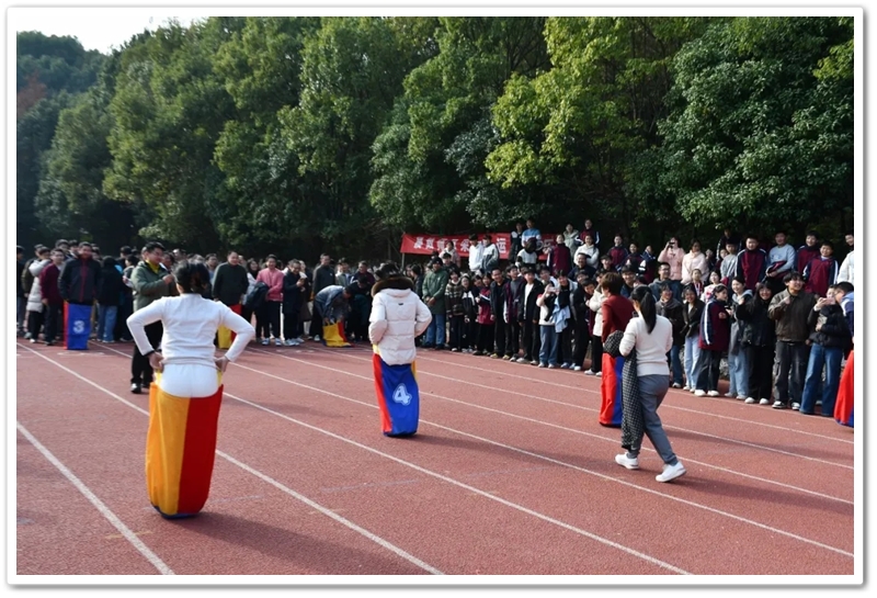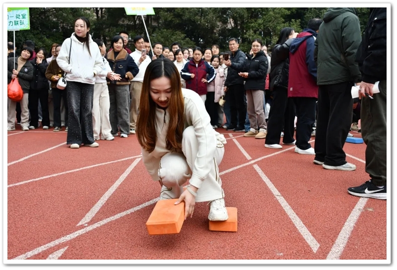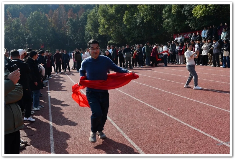 赛场上,各项趣味项目亮点纷呈、妙趣横生。“精准套圈王”既要眼准手稳,还要一点运气加成。老师们屏气凝神瞄准目标,每一次套中总要引发一场欢呼雀跃,实力与运气的碰撞让赛场氛围瞬间升温。“袋鼠跳”项目中,老师们身着布袋、手脚协同,找准节奏方能游刃有余,蹦蹦跳跳飞速前行。“摸石头过河”项目则将难度拉满,踩着道具石块稳步挪进,稍有不慎便会趔趄失衡,一个“连滚带爬”,引发全场欢笑;“腰缠万贯”项目考验着团队间的默契配合,一不小心就要撞个满怀;“螃蟹跑”项目要双腿顶着呼啦圈侧身前行,老师们手忙脚乱的姿态与奋力冲刺的模样形成鲜明反差,又让众人忍俊不禁……掌声与欢笑交织,运动场内俨然化作一片欢乐的海洋。