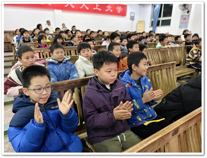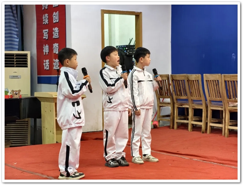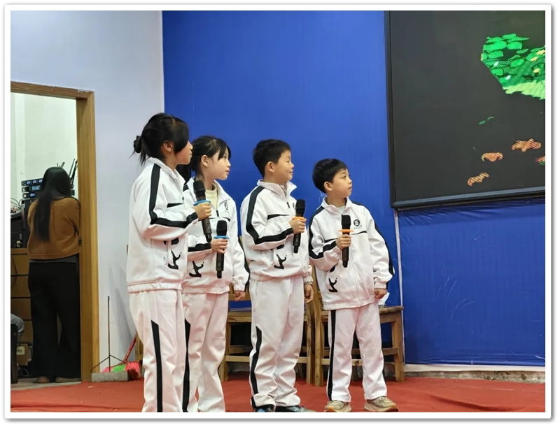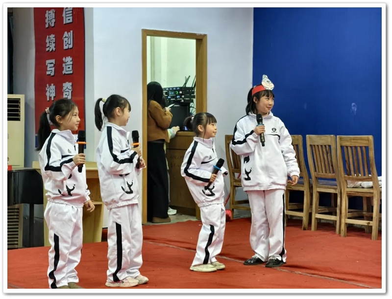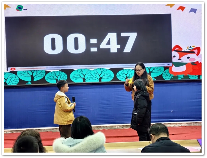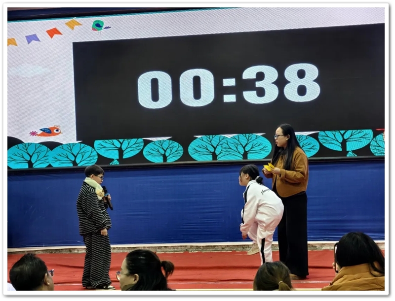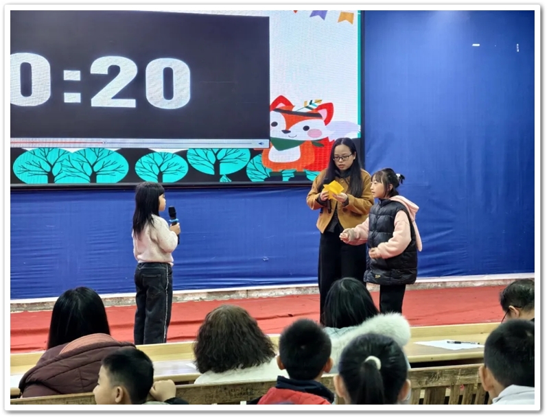 第二,游戏环节:你“划”我猜。为了消除观众和评委的些许疲劳,“你来比划我来猜”互动游戏环节欢乐开启,瞬间将现场的热烈氛围推向新的高潮。本次游戏特意结合三年级英语学习内容,涵盖了动物、文具等孩子们熟悉的词汇。游戏以小组为单位展开,每组由两名同学搭档协作。比划的同学使出浑身解数,借助简单的肢体动作提示单词特征;猜词的同学则凝神倾听、快速反应,时而眉头紧锁认真思索,时而灵光一闪脱口而出。台下的观众们也化身“场外智囊团”,跟着台上的节奏紧张不已,时不时高声喊出自己的答案,欢呼声、加油声、欢笑声交织在一起,回荡在整个活动现场。这个充满趣味的小游戏,不仅考验了同学们的默契配合,更让大家在轻松愉悦的氛围中巩固了英语知识,真正实现了“玩中学、学中乐”。