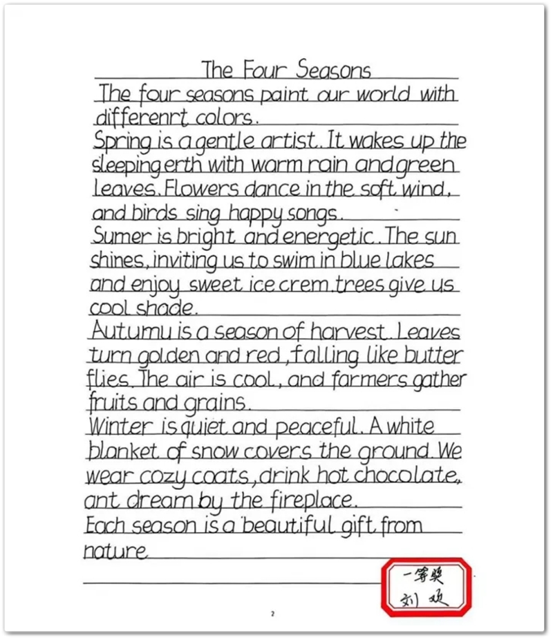 经过评委老师从字形规范、卷面整洁、整体布局等多方面的细致评选,最终涌现出一批优异的书写作品。这些作品不仅展现了扎实的书写功底,更体现了同学们追求卓越的认真品格。部分优秀作品将于校园文化长廊集中展示,成为一道启迪后学的亮丽风景。经过公平、公正的评选,最终评选出一等奖15名,二等奖25名,三等奖15名。获奖作品笔画流畅、结构匀称、卷面整洁,充分展现了六年级学生良好的英语书写风貌。
