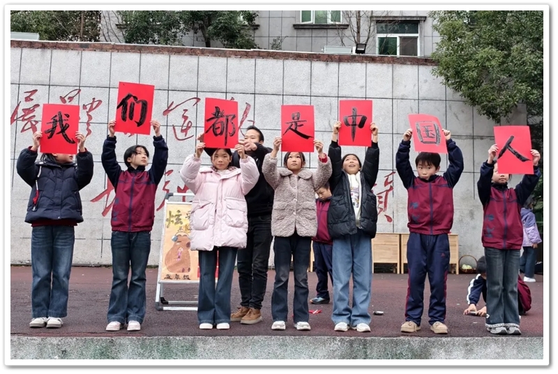在老师们大声歌唱的同时,主席台上,一群书法兴趣浓厚的同学,早已拿来毛笔,在红色的卡纸上悄悄写下了:“我们都是中国人”。几个大字顿时让人热血沸腾!