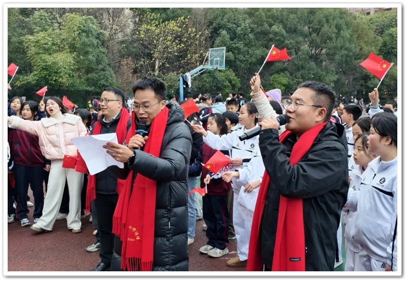 压轴登场的是合唱《中国人》,几位老师精神抖擞地走到台前,刚一开口,雄浑有力的歌声就惊艳全场,醇厚的嗓音回荡在运动场的每一个角落。台下的同学们瞬间沸腾,有的献上红围巾,有的纷纷“唰”地站起身,用力挥舞着手中的国旗,跟着节奏高声合唱,声音响彻云霄。
