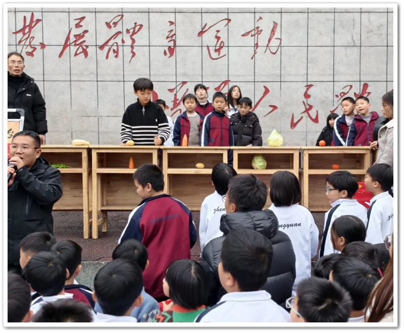参赛的同学眼睛紧紧盯着蔬菜,有人手疾眼快,一手抓起卷心菜和桌子里的卷心菜对上,惹得同学拍手叫好;有人稍显慌乱,把卷心菜和土豆弄混,引得自己哈哈大笑。鲜亮的蔬菜散发出活泼的色彩,童真的笑意洒满整个舞台。