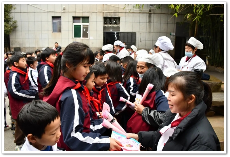 3月16日上午,一、二年级的孩子们化身“小小感恩使者”,将目光投向了默默付出的食堂叔叔阿姨。小朋友们穿戴整齐,手里攥着亲手绘制的彩色卡片,卡片上画着热气腾腾的饭菜、戴着白帽子的阿姨,还有歪歪扭扭的“谢谢阿姨”四个字,小脸上满是郑重与期待。她们来到了食堂叔叔阿姨身边,向她们表达祝福与感谢。
