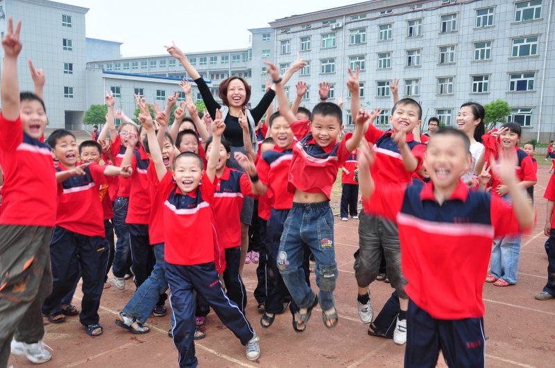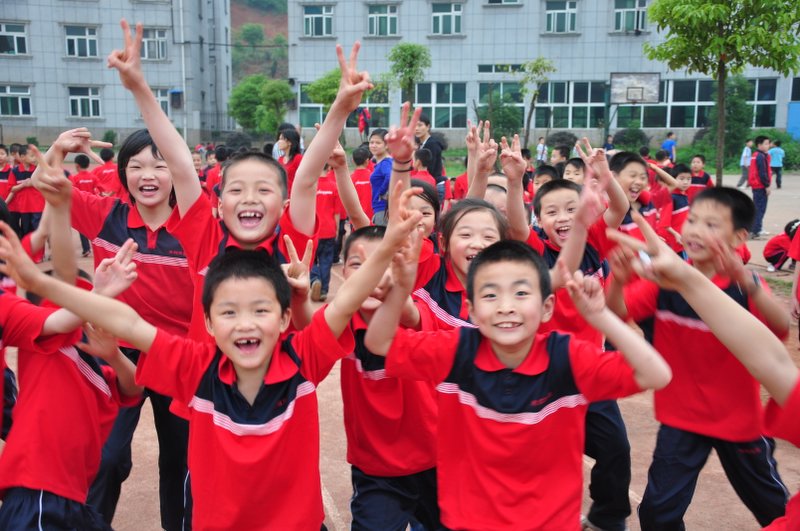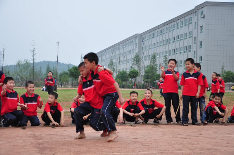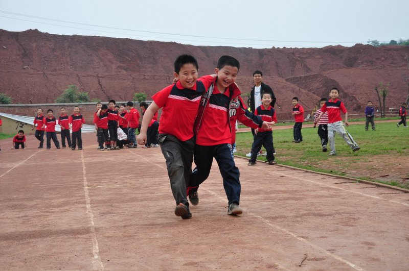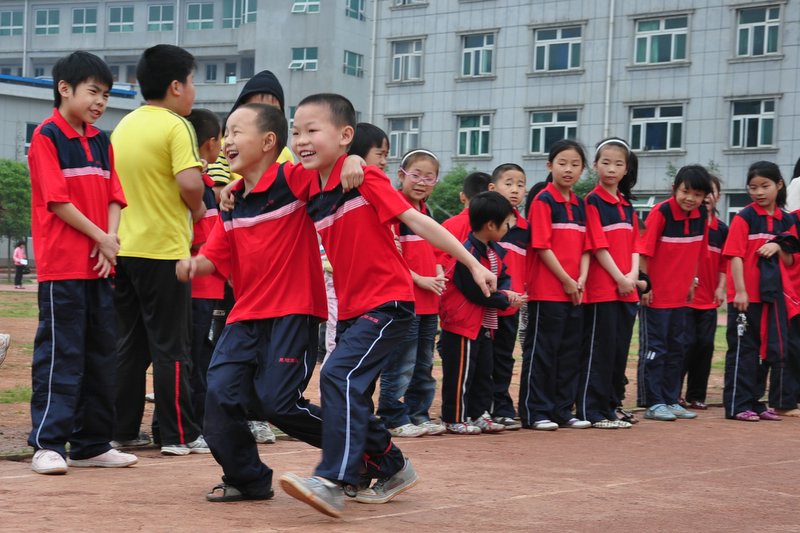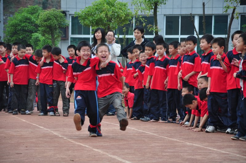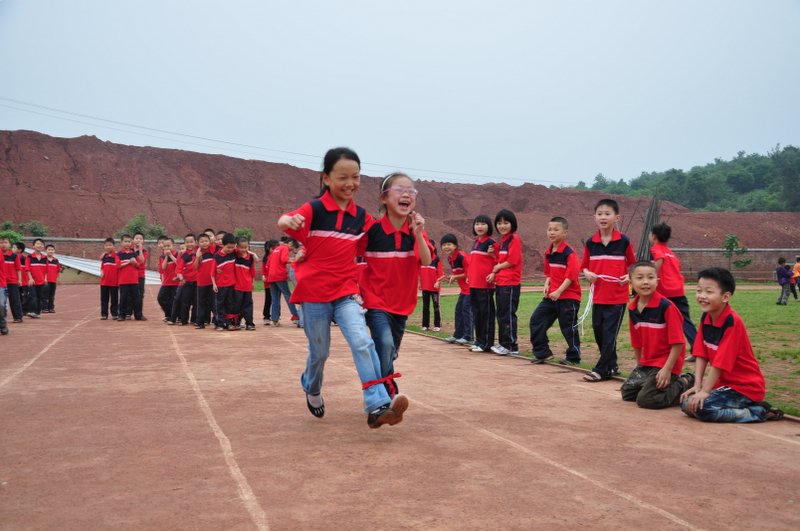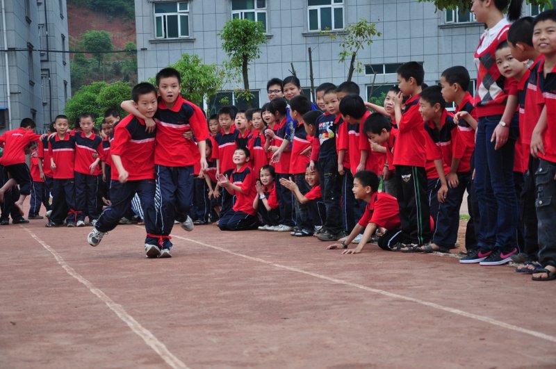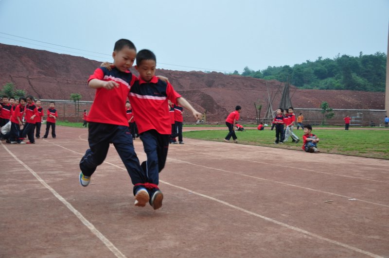 日下午,小学三年级六个班的学生,在塑胶运动场举行两人三足接力比赛。 小三(