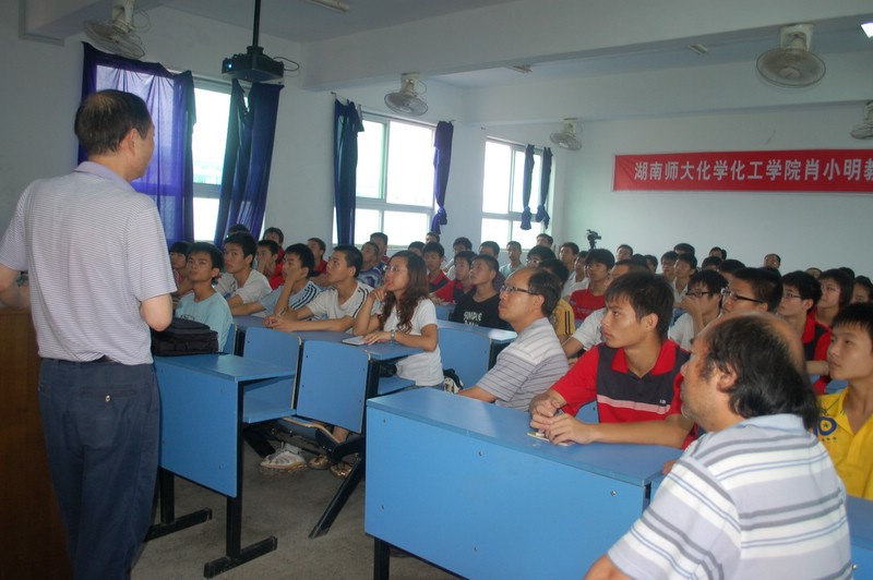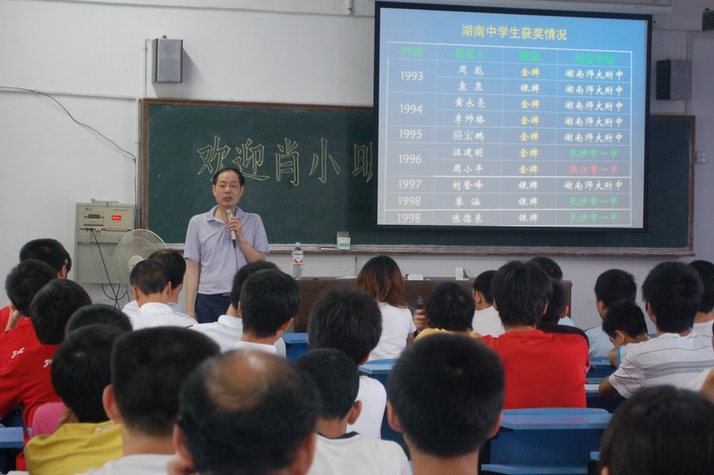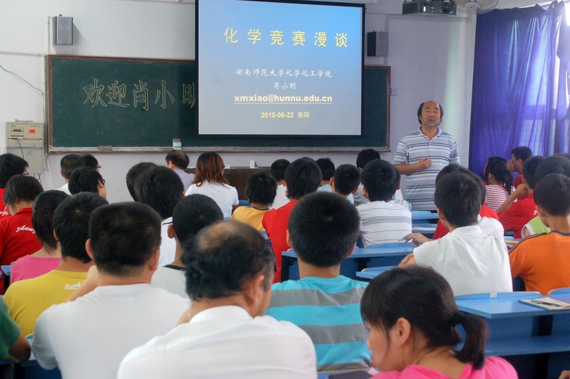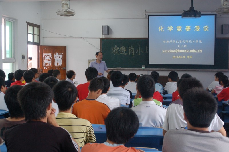 2010年6月22日,湖南师大化学化工学院副院长肖小明教授来我校讲学,《漫谈化学竞赛》,主要内容包括化学竞赛类型,化学竞赛的起源与发展,化学竞赛的目的,高中化学竞赛的程序与步骤,全国高中学生化学竞赛基本要求,中国选手在国际化学奥林匹克竞赛情况,近年初赛试题特点等七个方面。高一年级各班爱好化学的学生代表共50余人参加听课。一同莅临我校讲学活动的还有湖南大学化学化工学院副院长江国防教授等。